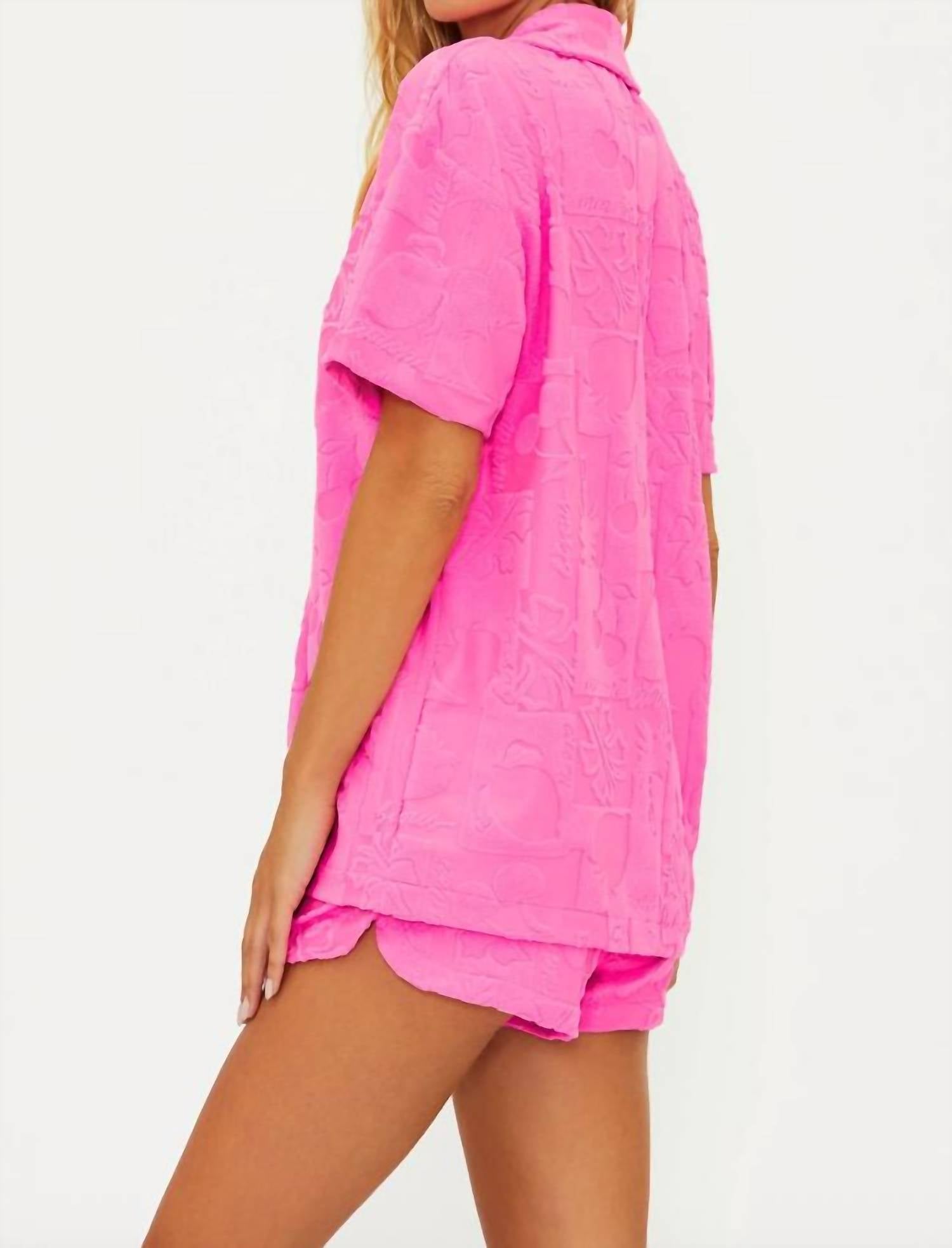 Descubra um estilo despojado com a Camisa de Manga Curta Mabel da Beach Riot, uma peça essencial para o verão em um tom rosa marcante. Confeccionada em tecido felpudo texturizado, esta blusa lisa é composta por 97% poliéster e 3% elastano, oferecendo um caimento confortável e oversized. Possui fecho frontal por botões e um elegante decote em V, perfeito para um dia de praia. Desenhada para mulheres, ela incorpora a tendência monocromática com uma combinação perfeita de estilo e conforto. A modelo veste tamanho P.