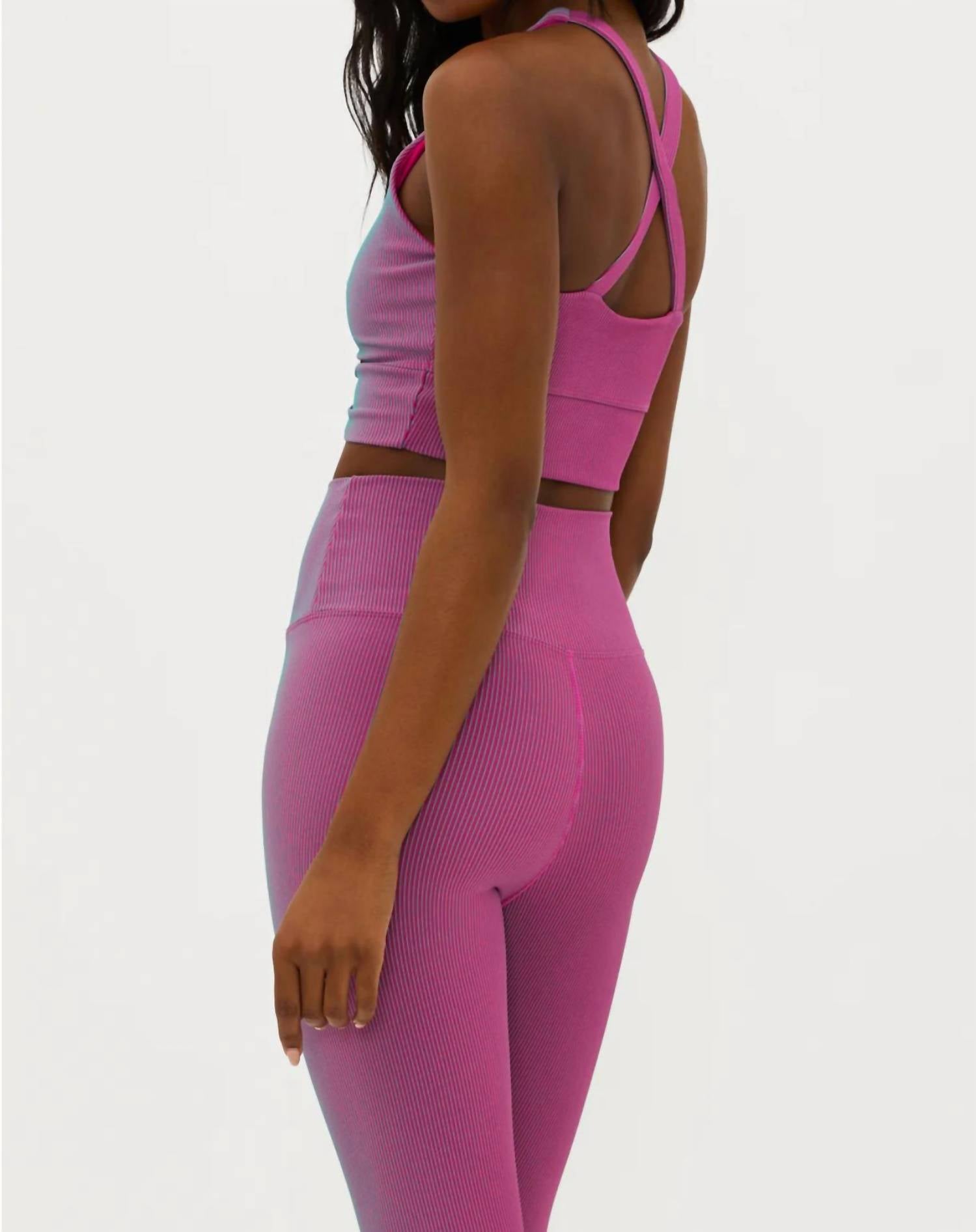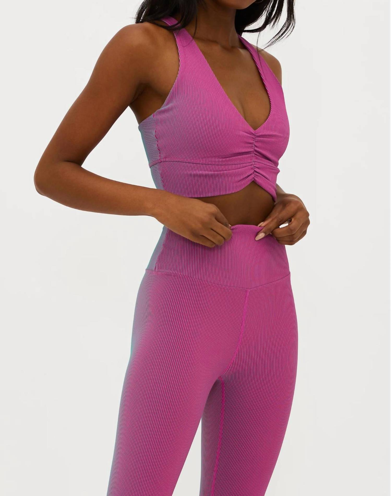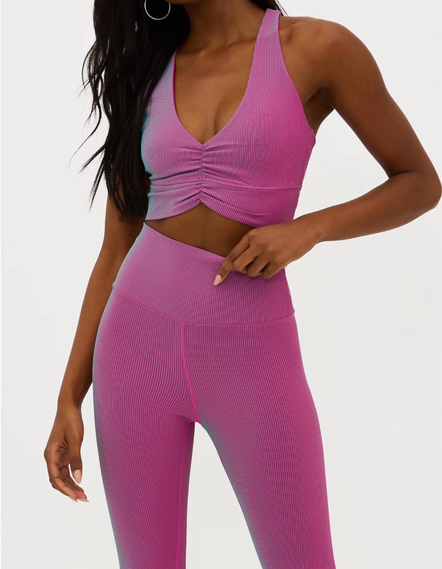 O top curto perfeito para os dias mais quentes. Apresentamos o Mindy Top da Beach Riot, um top cropped estiloso, projetado para conforto e estilo. Este top sem mangas, em um impressionante tom azul-petróleo bicolor e roxo-beterraba, apresenta decote redondo, alças cruzadas nas costas e um franzido central elegante. Composição: 66% nylon reciclado, 11% poliéster, 23% elastano, com fecho pull-on para facilitar o uso. Transforme seu look casual com esta peça estilosa com estampa listrada. A modelo veste tamanho pequeno.
