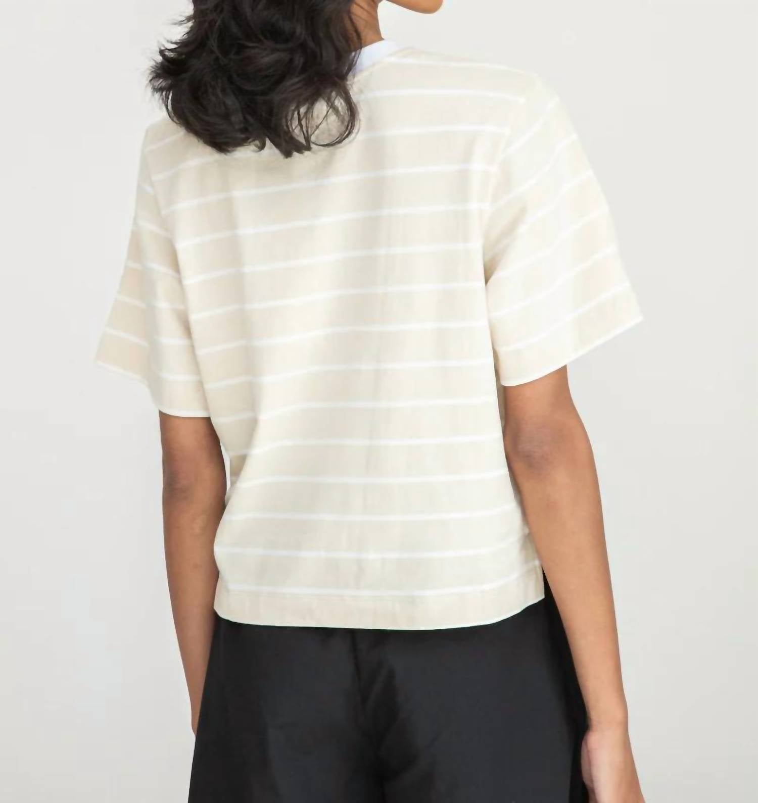 Minimalist tee perfect for spring travel. Women's short sleeve design features a stylish sand thin stripe pattern and a ribbed contrast crewneck. Crafted from 100% organic cotton in a boxy fit. Ethically made in Portugal for ultimate comfort. With a pull-on closure, breeze to layer and wear with ease. Model wears a size small and stands at 5'9".