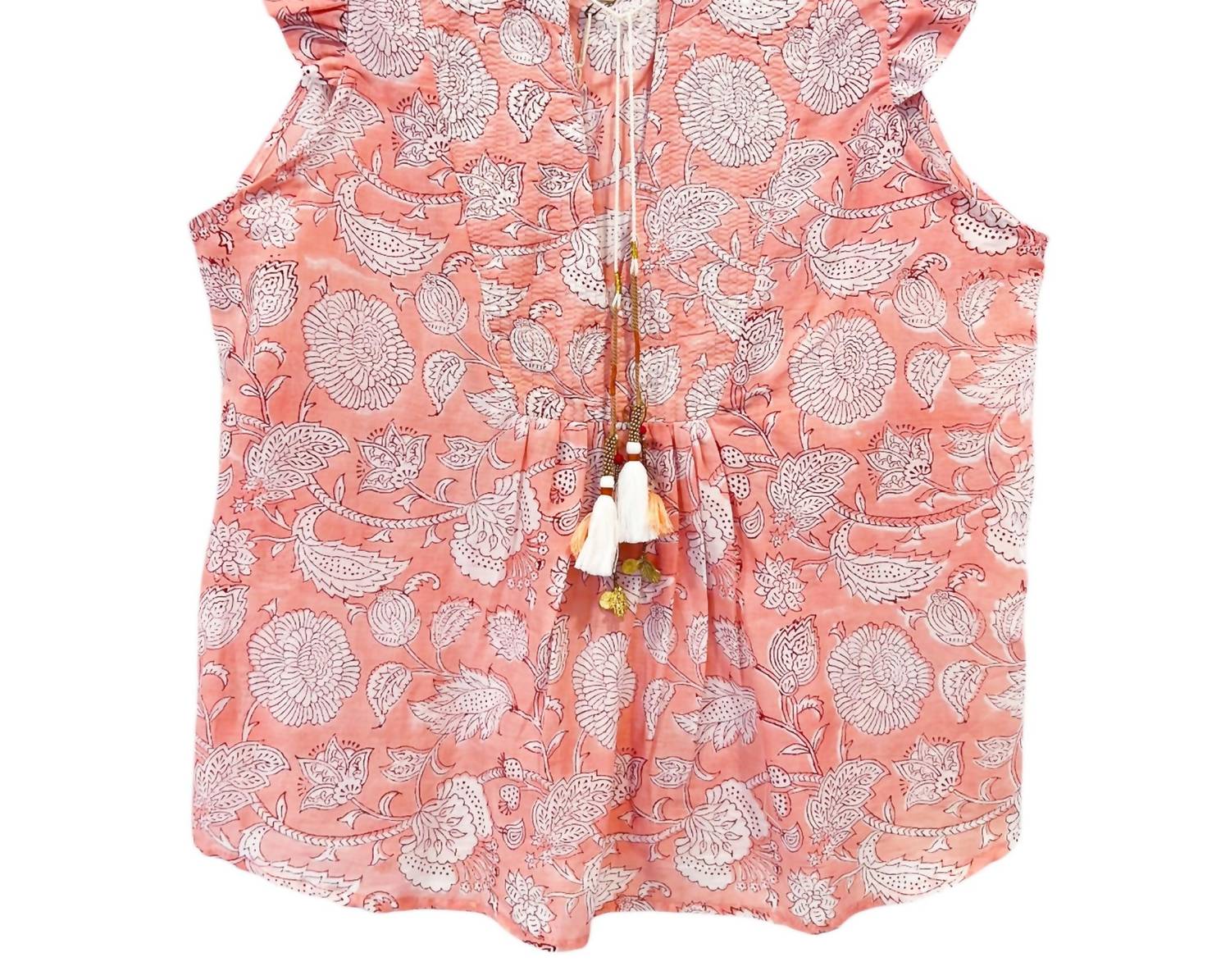 A versatile blouse that works from desk to dinner! Introducing the Flutter Sleeve Top by BELL, a charming piece in a peach print perfect for spring dressing. This blouse features cap sleeves and is made from a breathable blend of 70% cotton and 30% silk, ensuring a lightweight, relaxed fit. With a pull-on closure and crewneck design, it offers easy wear for casual pairings or layering. Its floral pattern and effortless elegance make it ideal for occasions like Thanksgiving dinner parties.