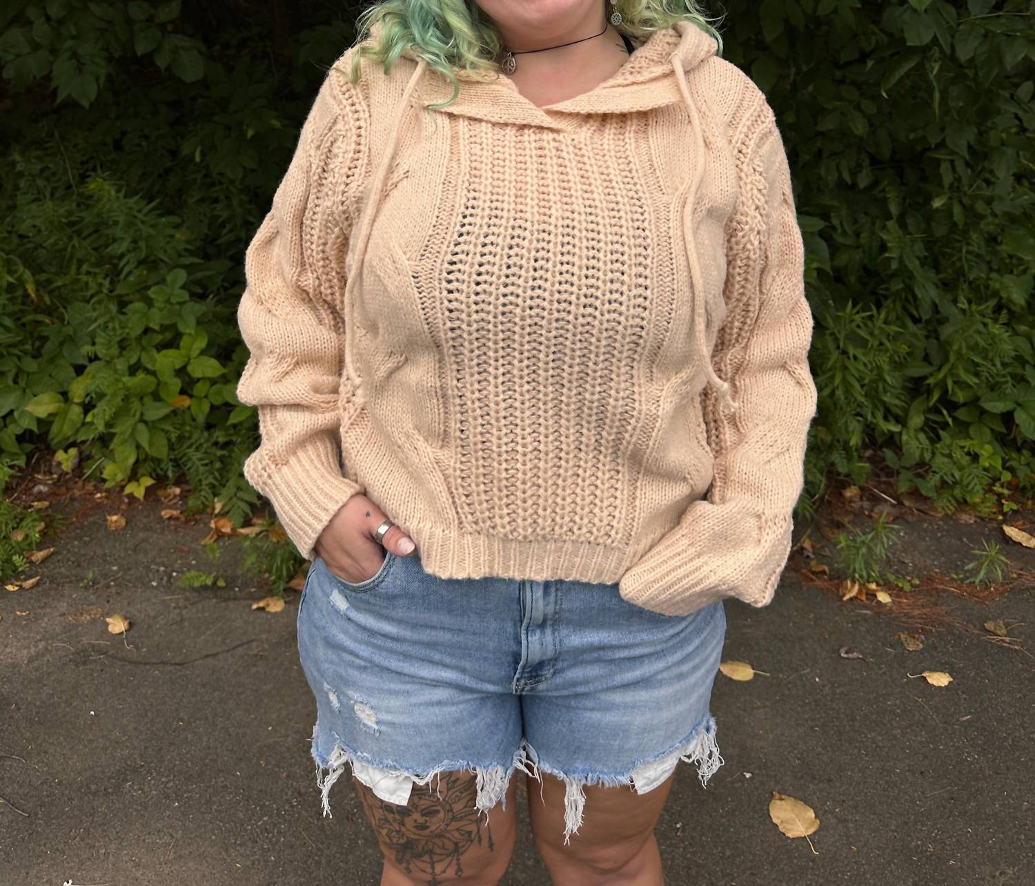 Presenting the Women's Ellie Oversized Cable Knit Hoodie by BiBi, a textured oatmeal staple for your boho chic wardrobe. Ideal for cool summer nights and fall days, this hoodie features long sleeves and a drawstring hood. Its mixed knit design offers an oversized fit for comfortable style. Closure is a pull on, and for easy care, simply machine wash.