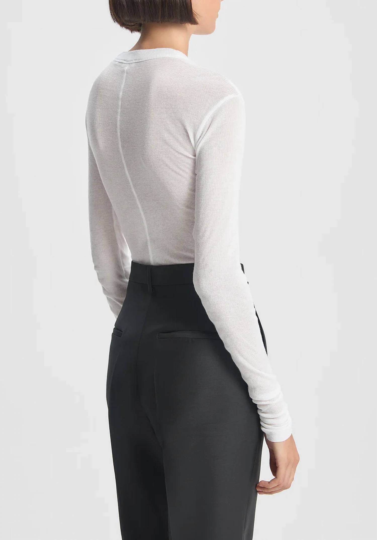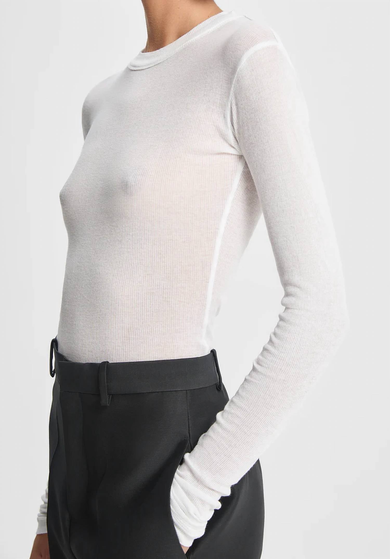 Introducing the Long-sleeve Thin Jersey T-shirt by BITE Studios, a minimalist piece crafted for a sheer, sophisticated look. This white tee features long sleeves and is made from 100% organic cotton, lending a subtly ribbed and textured finish. With a broad crewneck and back seam detailing, it’s perfect for evening events or layered styling. Originating from Portugal, it should be machine washed at 30 degrees and line-dried for best care.