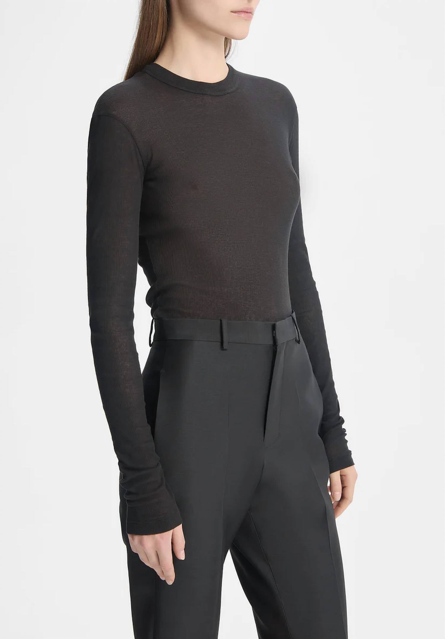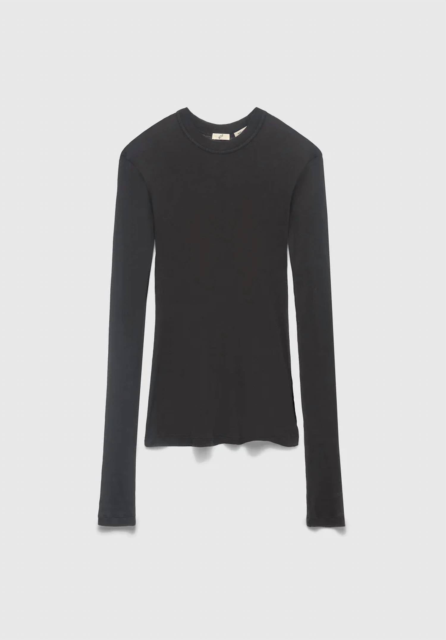 Introducing the Long-sleeve Thin Jersey T-shirt by BITE Studios, a minimalist piece in a subtly textured black designed for women who appreciate elegance with a modern touch. Crafted from 100% organic cotton, this sheer top features elongated long sleeves and a crewneck, made to perfection in Portugal. Closure: Pull on. Care: Machine wash at 30 degrees, line dry. Ideal for evening events, it elevates any look with ease.