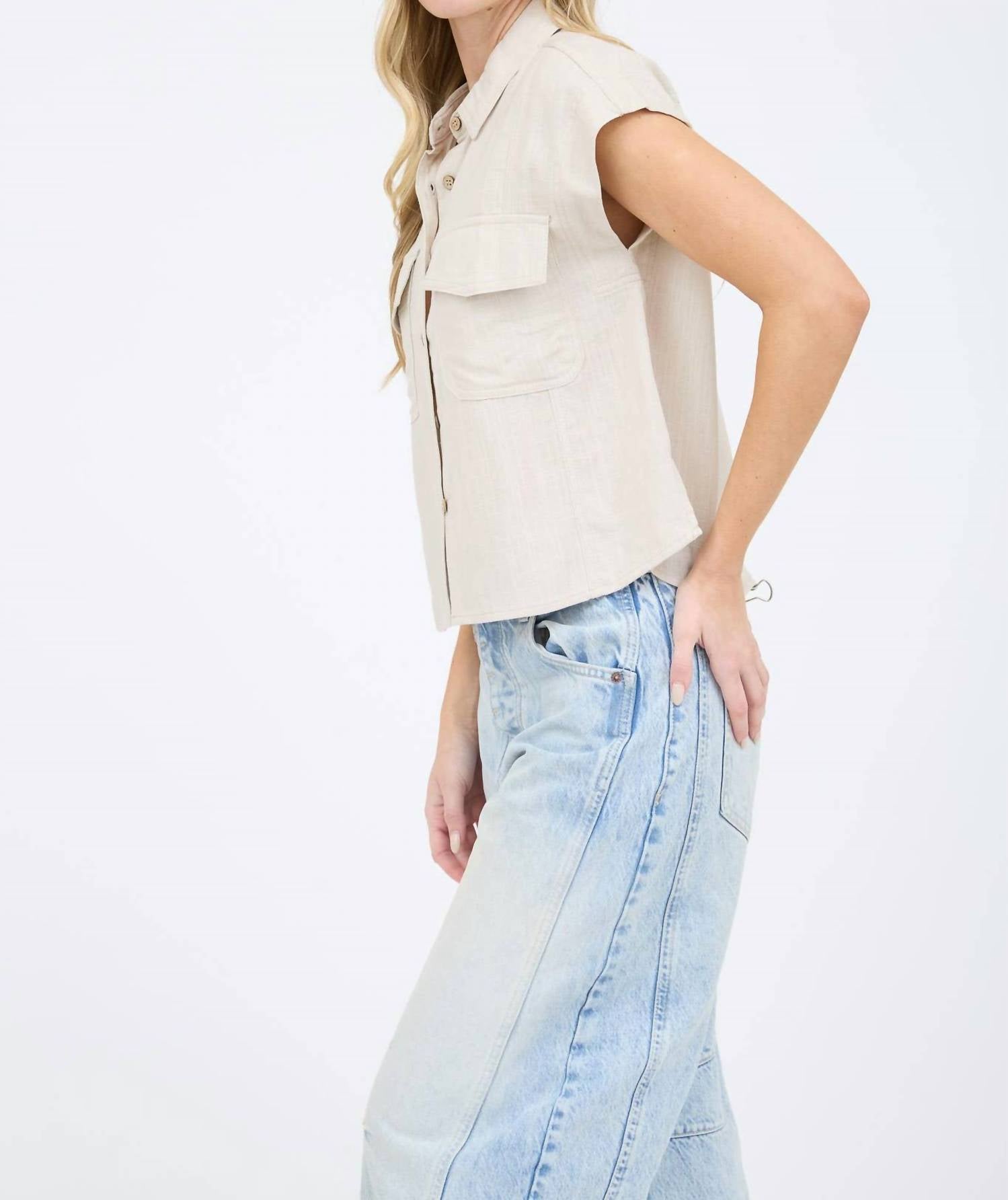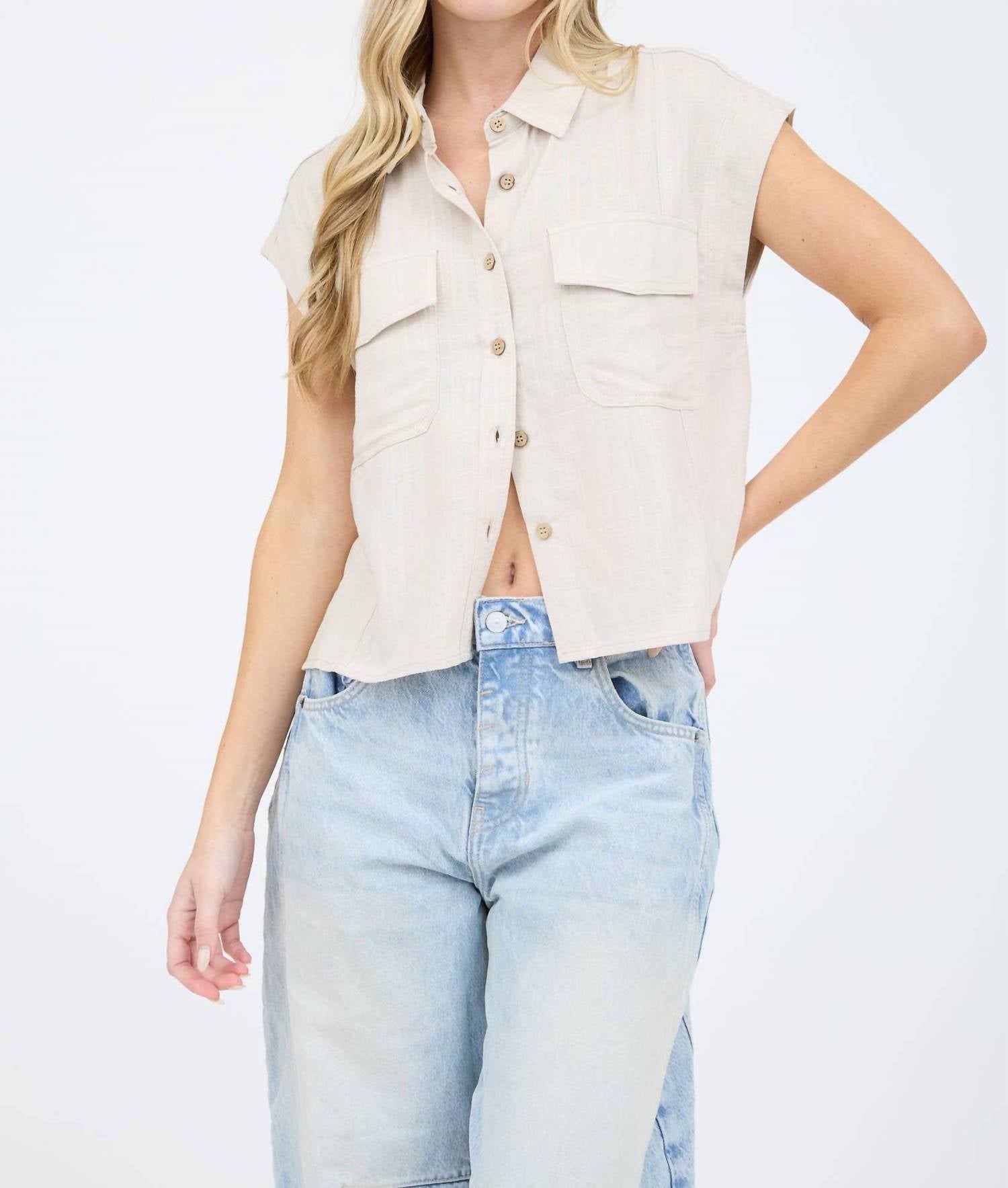 Discover the Short Sleeve Linen Button Down Shirt by Blu Pepper, an off-white masterpiece designed for relaxed elegance. This top features short sleeves, a collared neck, and a textured solid look, thanks to its 85% Rayon and 15% Linen blend. With a boxy fit and practical flap pockets, it's the perfect blend of style and functionality. Closure: Button closure. Care: Machine wash. Ideal for minimalist spring travel and Easter occasions.