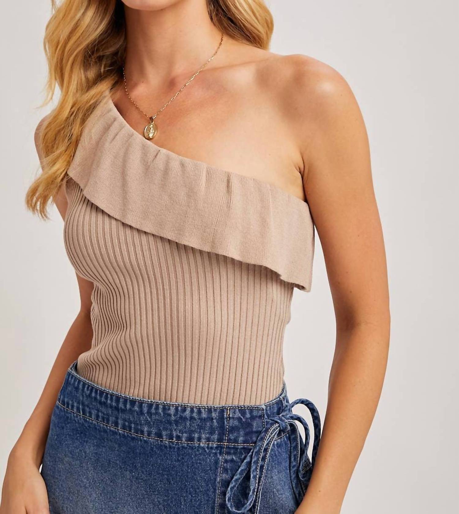 Elevate your evening style with the Gemma Ruffled One Shoulder Top from BluIvy, a sand-colored sleeveless piece perfect for a chic dinner party. Crafted from a textured viscose blend, this top features a figure-skimming ribbed knit and an asymmetrical off-the-shoulder neckline. Closure is a convenient pull-on style. Model is 5'9" and wearing a size small; sizes run true to size (Small 2/4, Medium 6/8, Large 10/12). Ideal for New Year's Eve or embracing the Y2K trend.