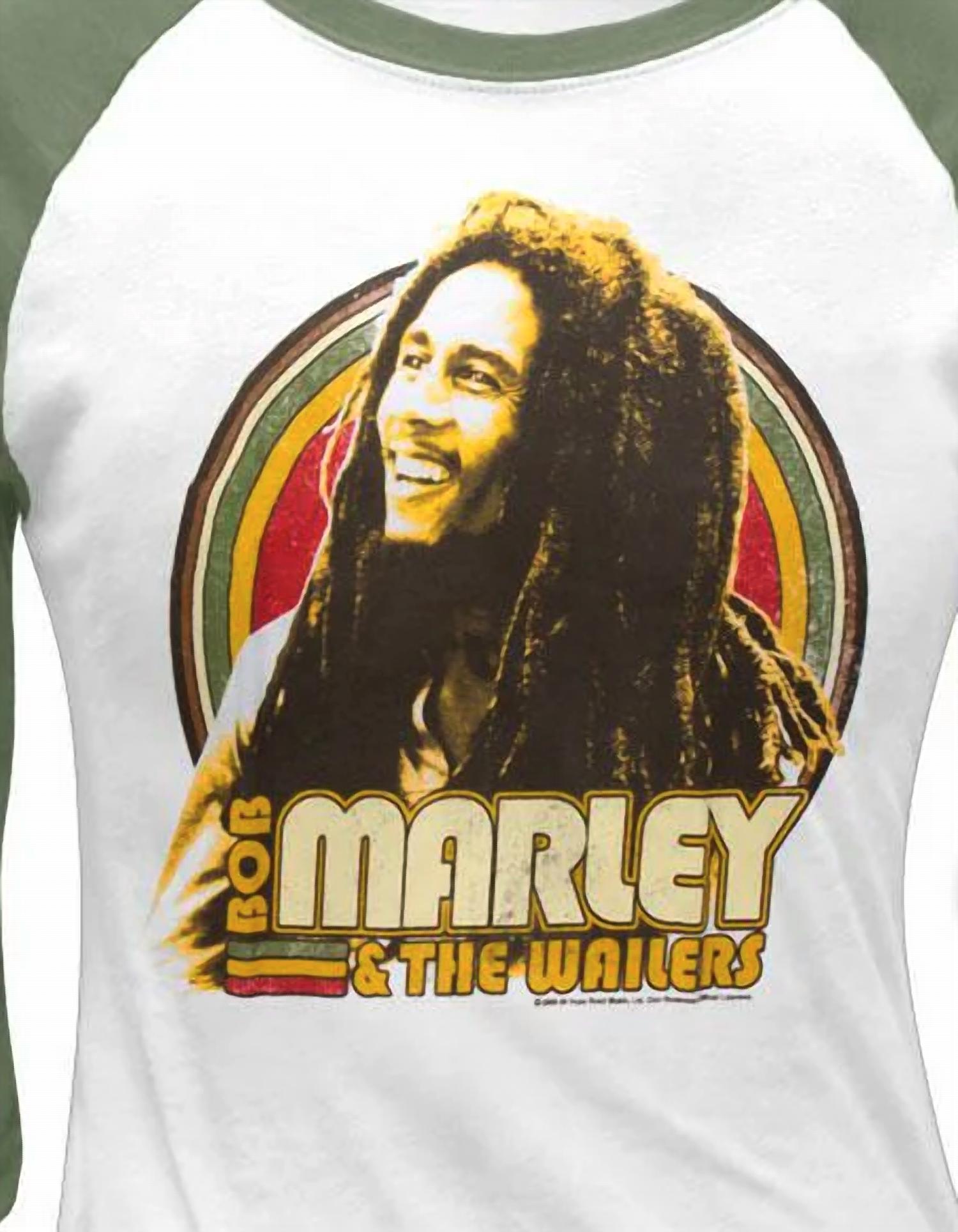 Celebrate timeless style with the Women's Wailers Juniors Raglan Tee by Bob Marley, featuring iconic three-quarter length sleeves. Crafted from 100% cotton, this tee promises comfort and breathability in a casual crewneck design. Express your love for the legendary Bob Marley with a classic graphic print, effortlessly combining streetwear trend with a relaxed holiday spirit. The pull-on closure makes it easy to slip into for any occasion.