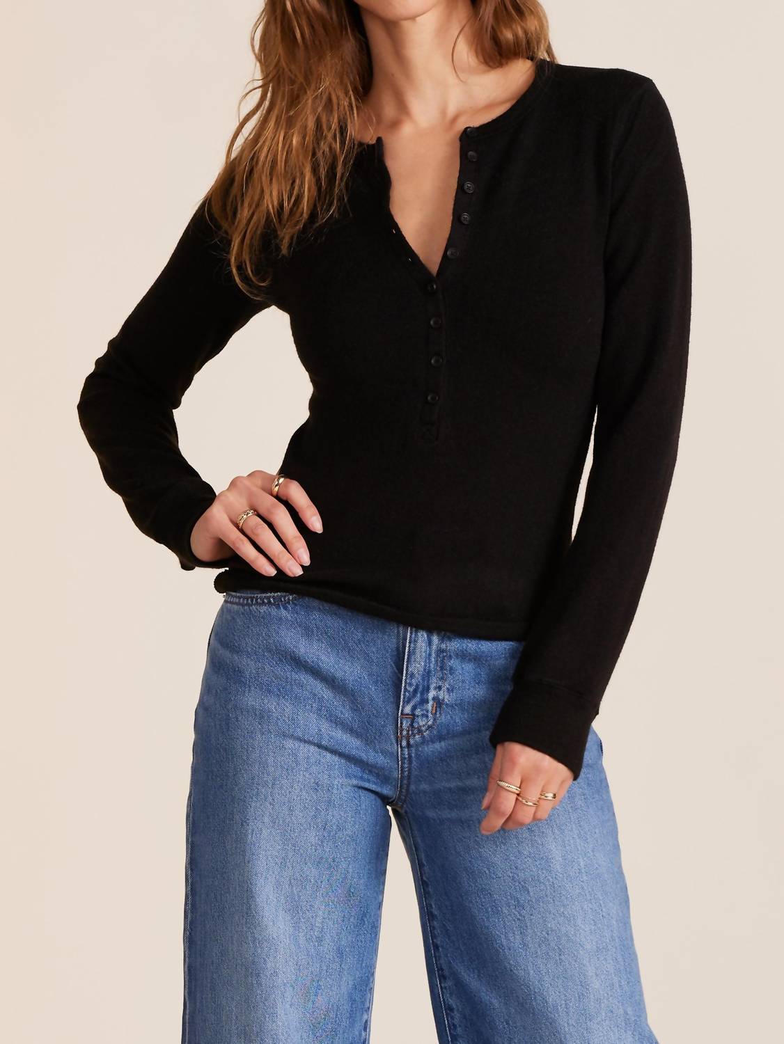 A long sleeve top you can wear with denim, skirts, well... just about anything! Introducing the Long Sleeve Slim Button Placket Tee by Bobi, a timeless wardrobe staple in classic black. Crafted from a comfortable nylon blend, this solid crewneck tee is designed with long sleeves and a 22-inch length for a chic, minimalist look. Closure: Button closure. Care: Hand wash cold, lay flat to dry, making it a perfect addition for a back-to-school or fall wardrobe.