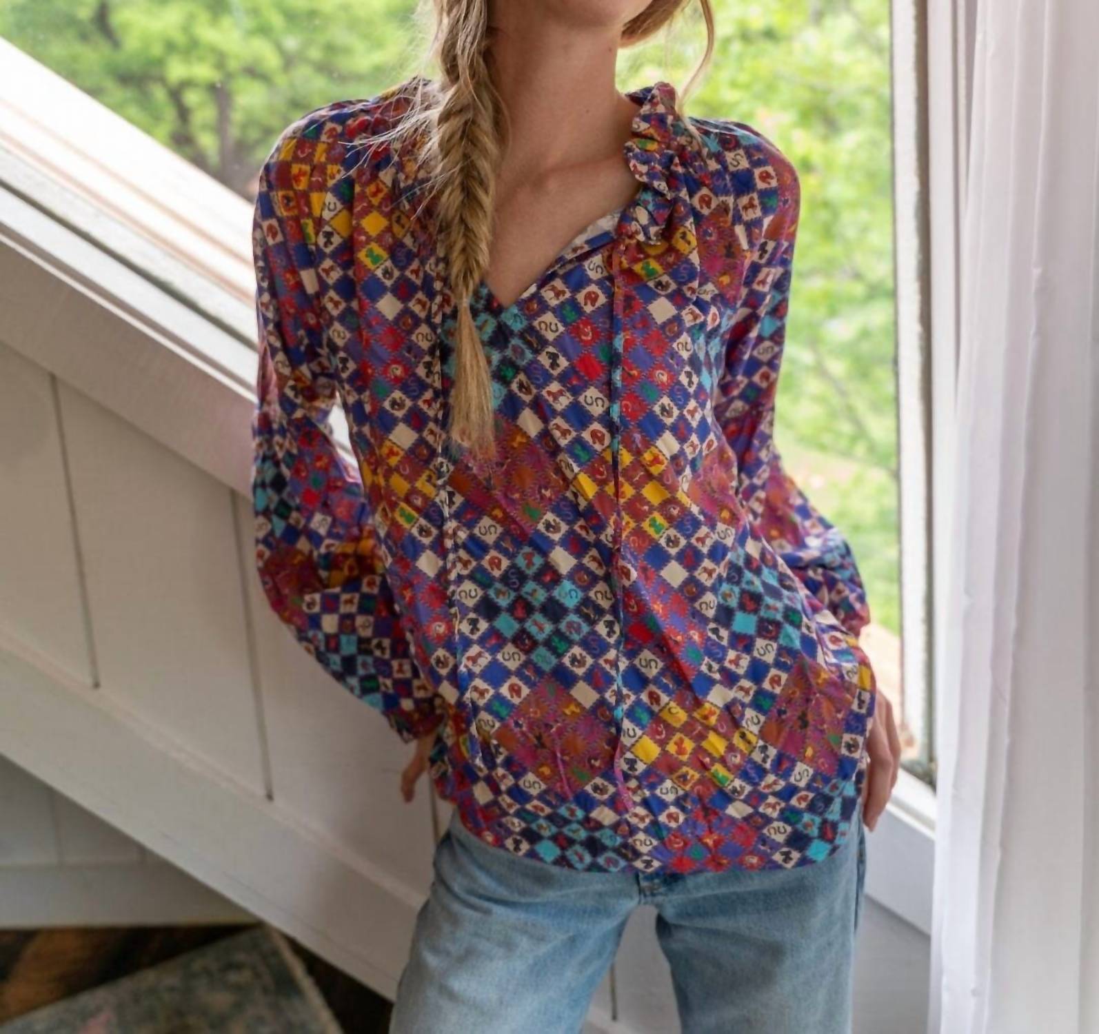 Elevate your fall wardrobe with the Norah Top by Briton Court, a statement piece in a vibrant blue multi swirl print. This top features long sleeves with elastic cuffs and a split V-neckline with a charming tassel tie detail. Designed for effortless style, it offers a flowy, relaxed silhouette perfect for versatile wear. Closure: Pull on. Care: Machine wash.