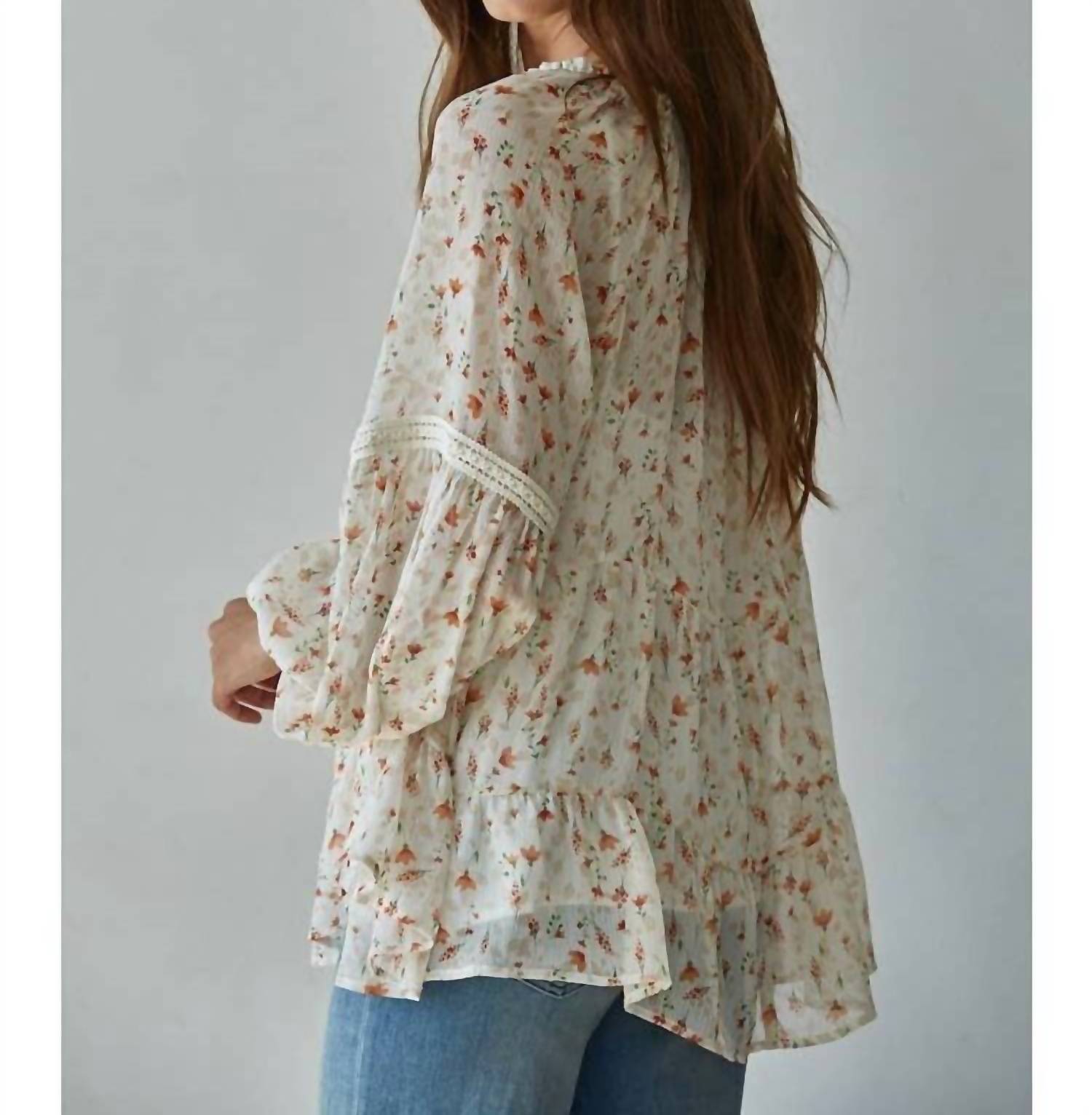 Discover effortless elegance with the Soft Floral Top by By Together, perfect for your boho chic wardrobe. This ivory, long-sleeve blouse features a captivating floral print that exudes vacation vibes. Crafted from 100% polyester, this women's blouse includes a stylish tie closure and a flattering V-neckline. Designed for easy wear, it seamlessly complements your summer occasion looks.
