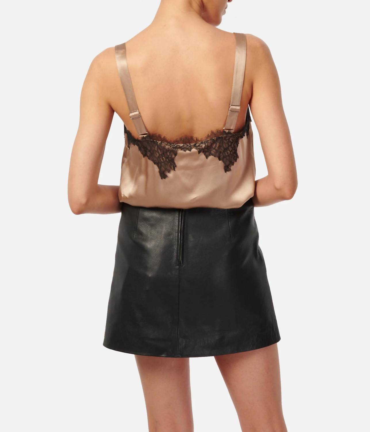 Introducing the Beatrice Camisole by Cami NYC, a sophisticated addition to your wardrobe in an elegant champagne hue. This luxurious camisole is crafted from 100% silk and features delicate spaghetti straps and a stylish V-neckline, enhanced with black contrast applied lace for a refined touch. Its relaxed fit with side slits ensures ease of movement, while adjustable straps offer a customized fit. Imported and unlined, this piece is easy to care for with dry clean only instructions, making it a timeless choice for any occasion.