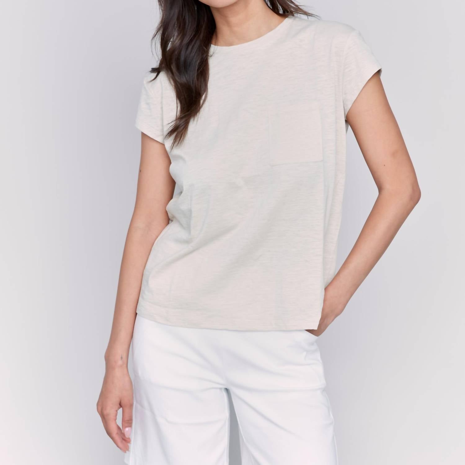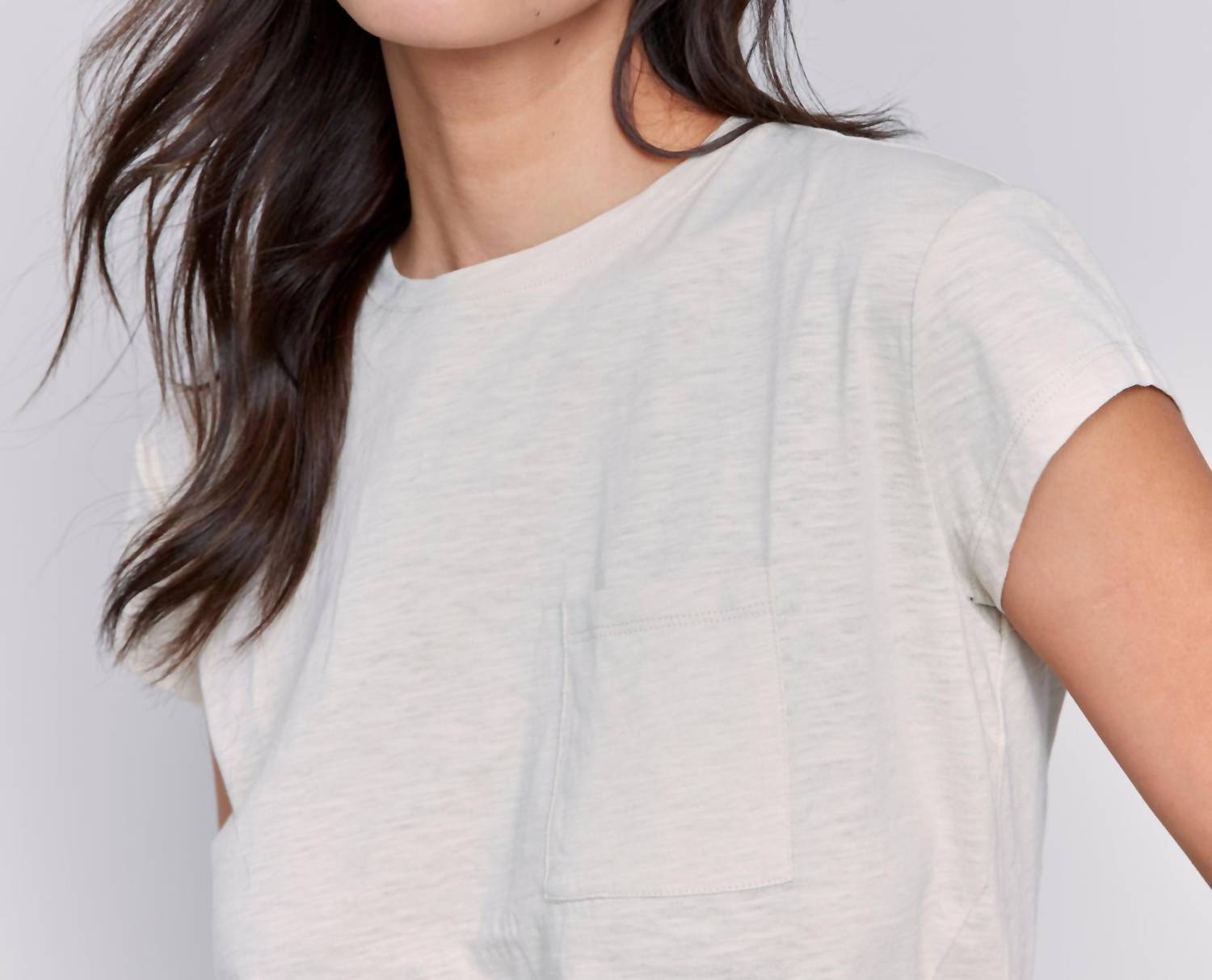 This classic, short sleeve tee will be your go-to staple this season and beyond. Meet the Cap Sleeve Tee with Chest Pocket Detail by CHARLIE B, an essential for minimalist and vacation wardrobes alike. This women's tee in a solid sand color features cap sleeves and a convenient chest pocket, perfect for those spring outings or Thanksgiving gatherings. Composed of 100% organic cotton, this tee offers supreme comfort with a garment length of 23 inches and a crewneck design. Closure: Pull on. Care: Hand wash in cold water, lay flat to dry, iron on low, and dry clean if necessary.