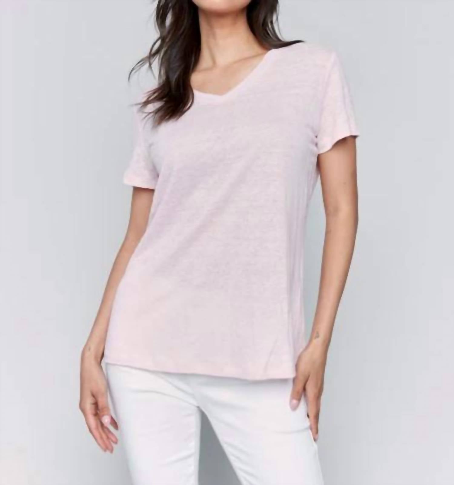 Look no further, you just found your perfect tee! Meet the Short Sleeve V-neck T-shirt by CHARLIE B, a must-have for your summer wardrobe. This natural, solid-colored tee features short sleeves and a stylish V-neck with neckband detail. Crafted from a linen blend of 55% Linen and 45% Viscose, its back length measures 25 inches, making it both comfortable and chic. With a pull-on closure, it's easy to wear and maintain, simply hand wash and lay flat to dry.