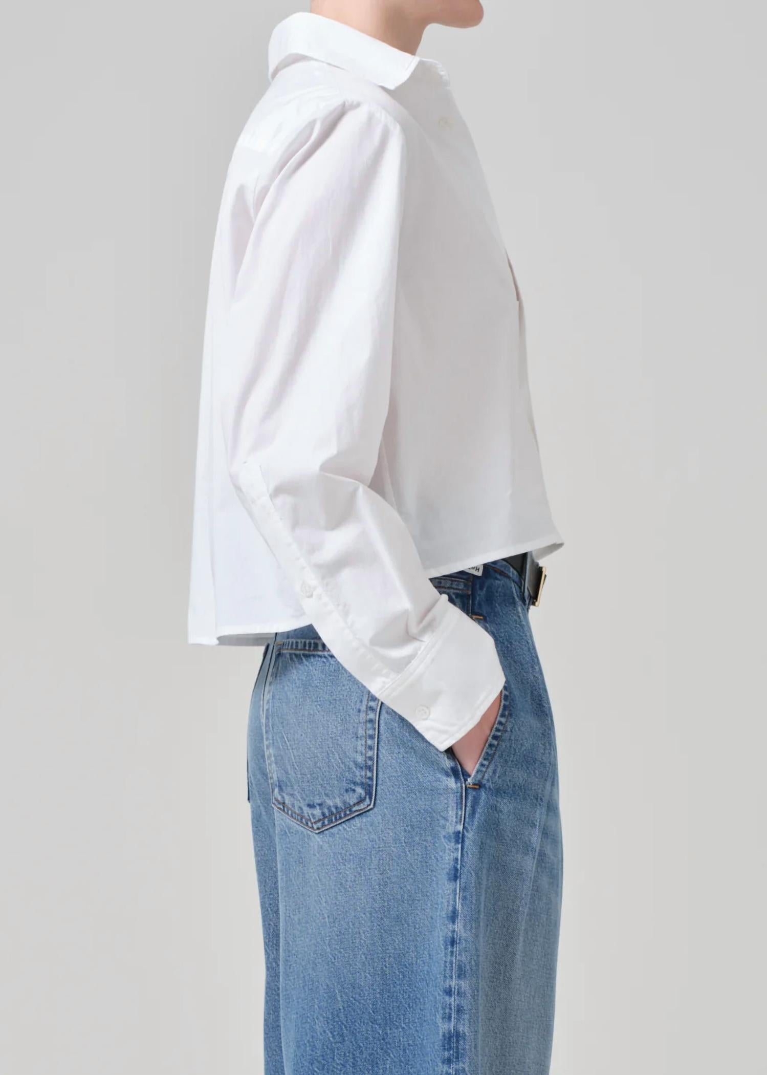This button down shirt is comfortable yet polished. Elevate your travel wardrobe with the Fino Cropped Shirt by Citizens of Humanity in Optic White, an embodiment of minimalist spring style. This women's long-sleeve shirt is crafted from 100% lightweight, breathable cotton, ensuring comfort and effortless elegance. Designed to flatter with a true-to-size boxy fit, it features a button closure and a garment length of 20.5". Care for your piece easily with machine wash instructions; model is 5'10" and wears a size Small.