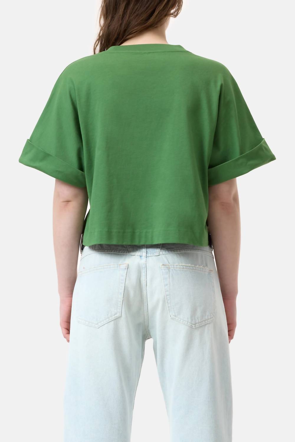 Staple piece for any casual wardrobe. Crafted from high-quality cotton. Features short, cuffed sleeves and a classic crewneck design that enhances its minimalist appeal. Solid matcha green color aligns perfectly with a variety of styles, ideal for a grunge-inspired travel outfit.