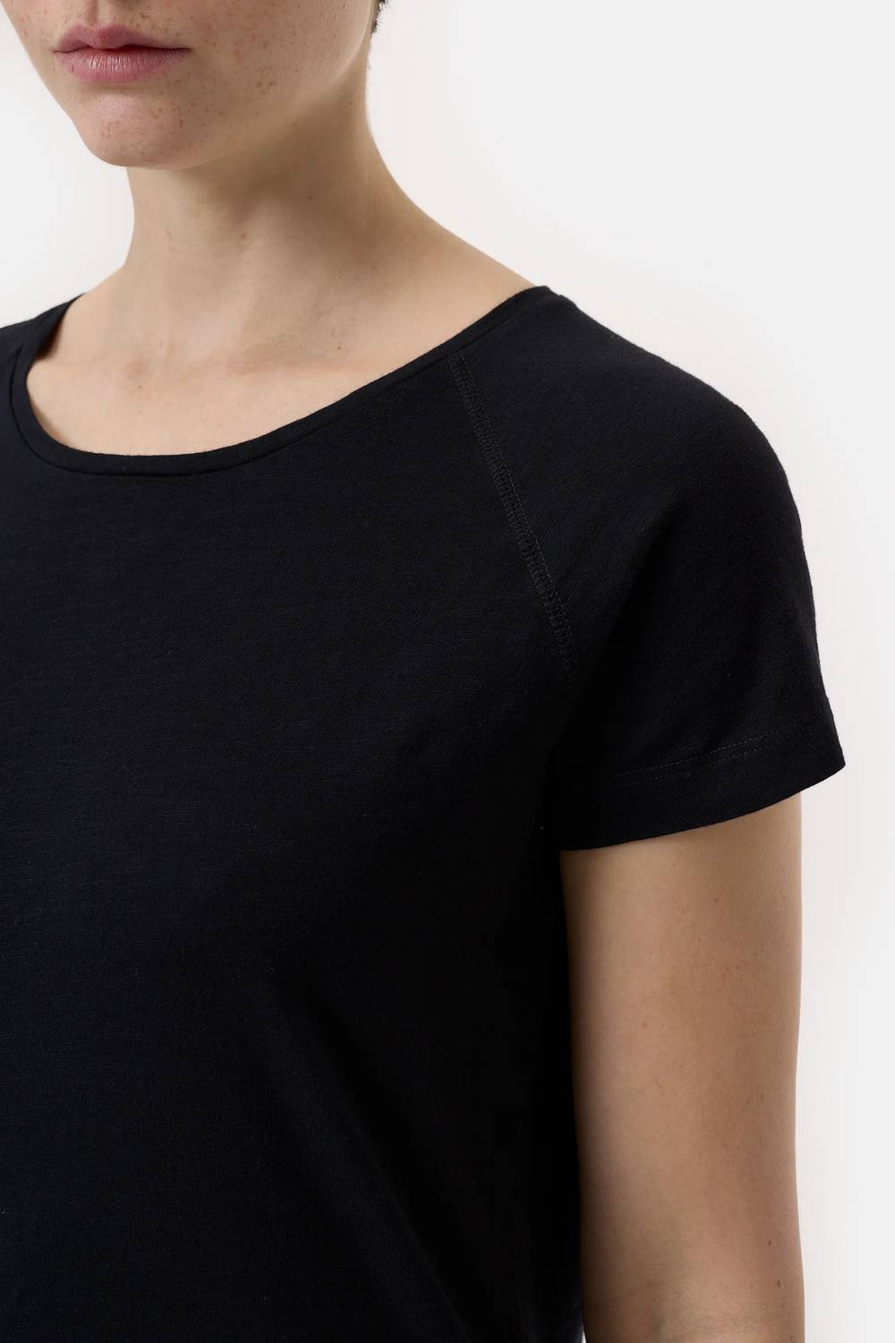 Discover the Raglan Cotton T-shirt by CLOSED, crafted for comfort and style in classic black. This women's tee features short raglan sleeves, a crewneck, and a regular fit with a total length of 26 inches. It is composed of 100% pure cotton with a soft slub jersey texture, offering a casual yet refined look. Designed and made in Portugal, this pull-on tee is machine washable for easy care.