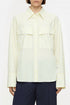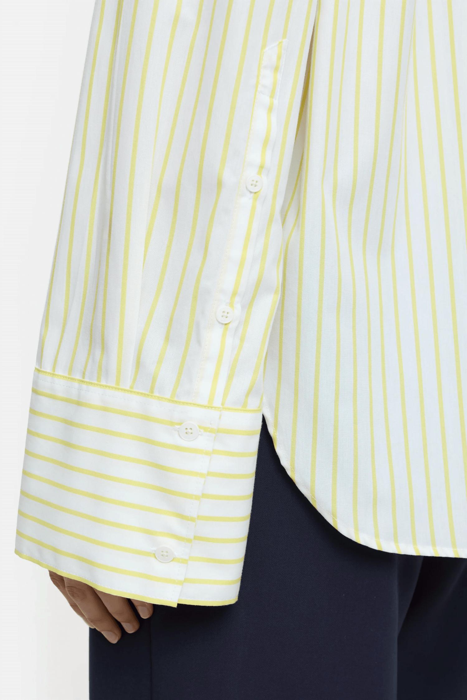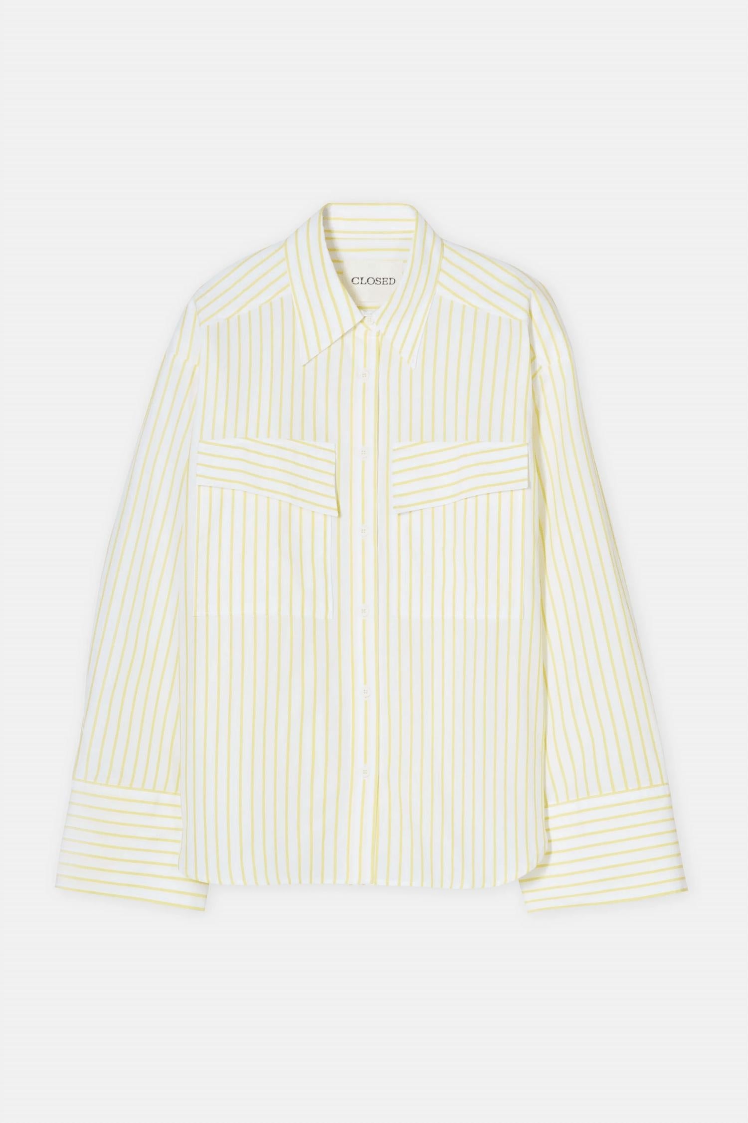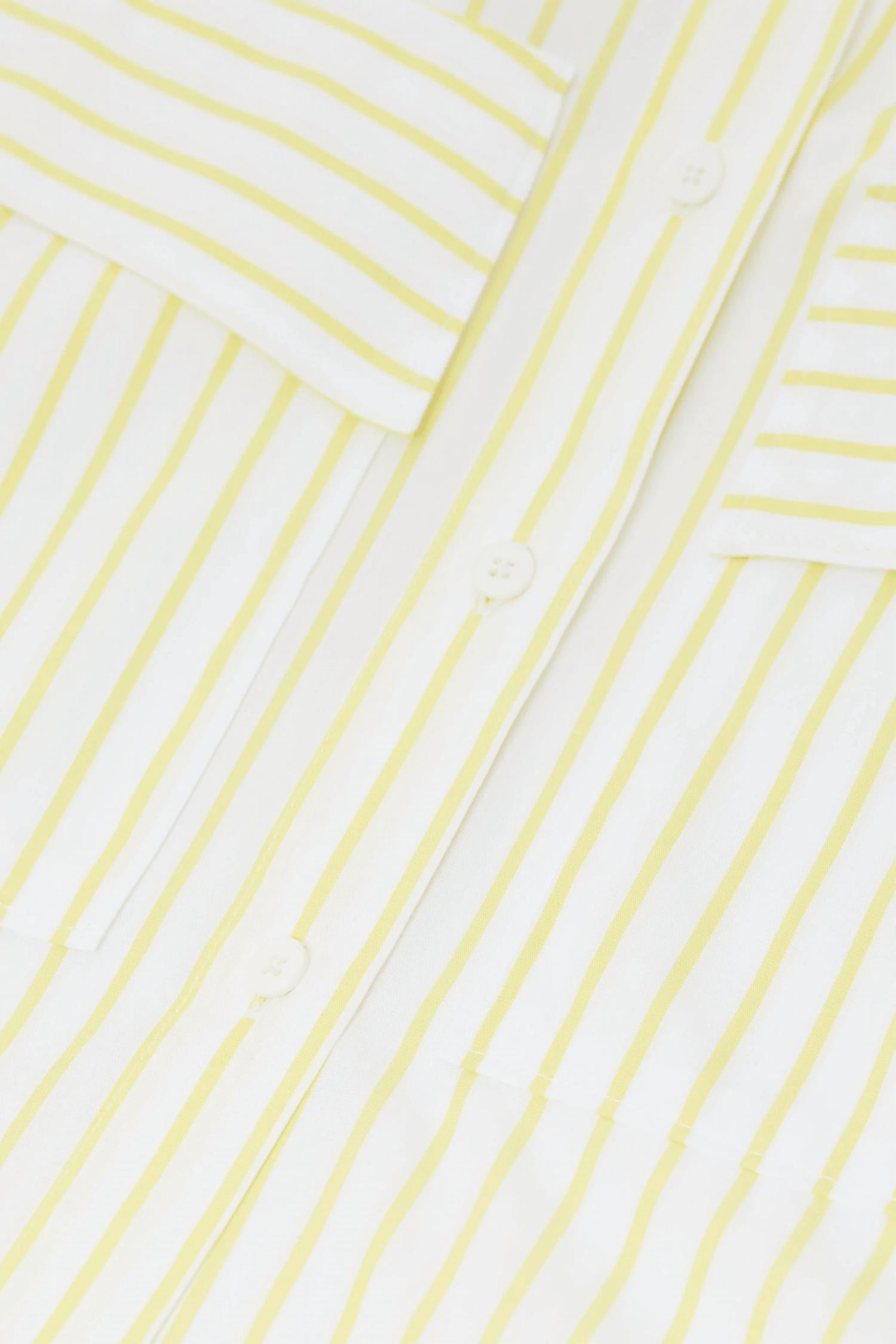 Introducing the CLOSED Utility Button Down Shirt in a refreshing Lemon Yellow, perfect for summer travels. This long sleeve shirt is crafted from 100% organic cotton in a Portuguese poplin fabric, showcasing a classic striped design. Featuring utility elements like large breast pockets, dropped shoulders, and a rounded hemline, it offers a relaxed fit at a length of 27.8 inches in size S. Made entirely in Portugal, this piece supports high-quality craftsmanship with a button closure and is easy to care for with machine wash instructions. Model is 5'8" and wearing a size S.