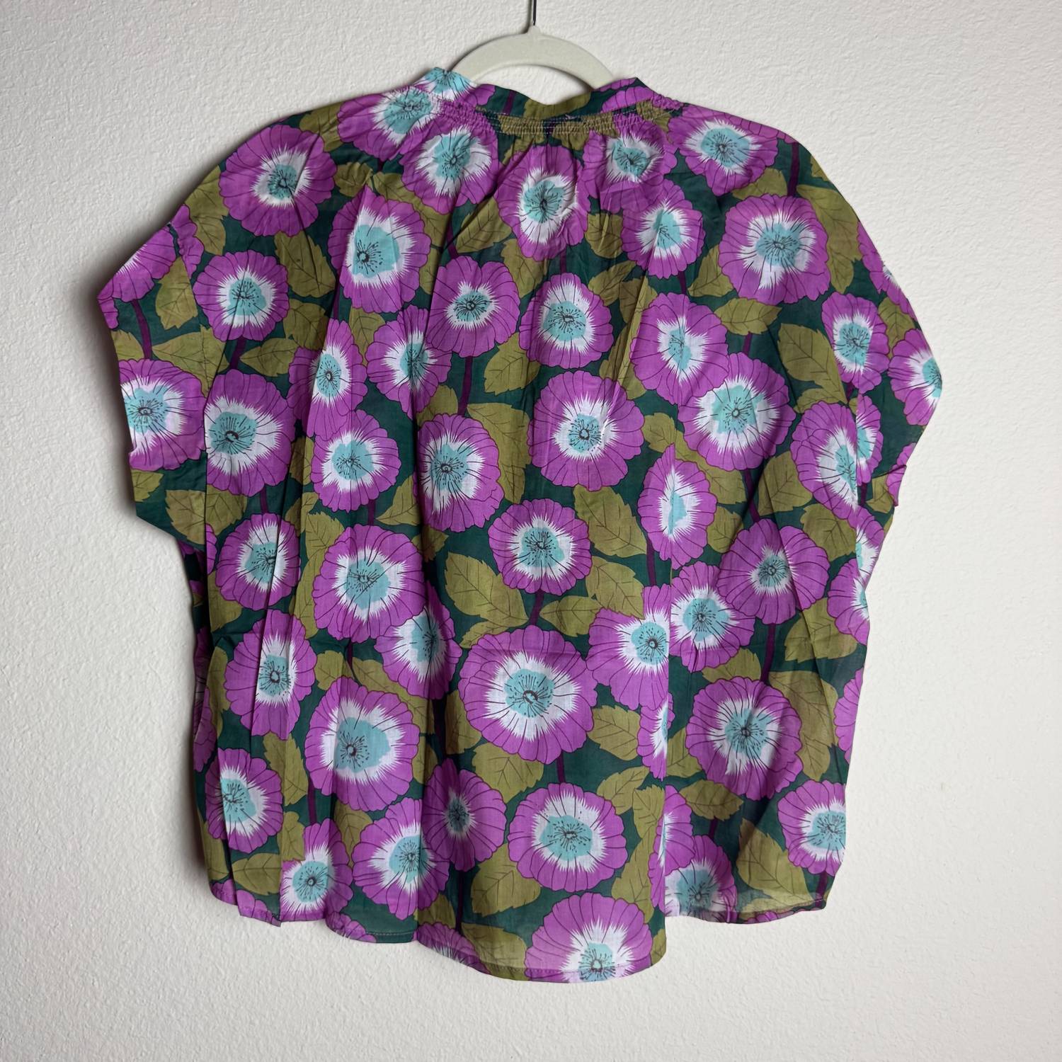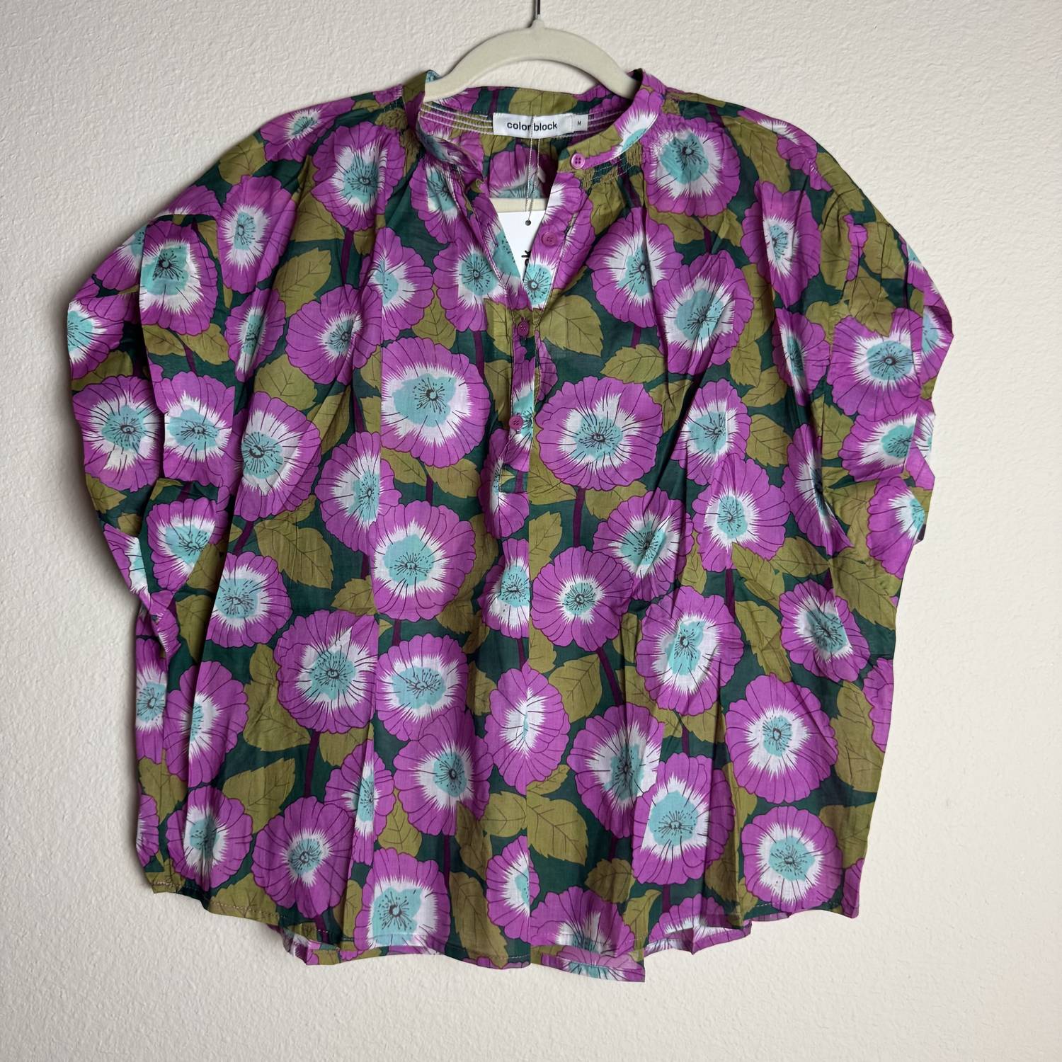 Introducing the Floral Sleeveless Quarter Button Front Blouse by Colorblock, a perfect addition to your wardrobe for a touch of bohemian charm. Crafted from 100% cotton, this purple blouse features a delicate floral pattern on a sleeveless design with a V-neckline. Made for effortless style, it includes a quarter button closure for added flair. Ideal for spring vacations and Mother's Day festivities.