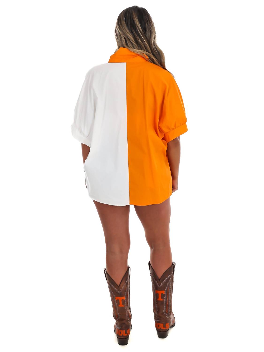 Elevate your game day style with the Two Tone Button Down Top by day + moon, designed in a striking Tangerine/White colorway. This women's short sleeve shirt features a contrasting collar and a minimalist solid pattern, making it perfect for spring vacations or Thanksgiving gatherings. Closure: Button closure. Care: Hand wash and line dry for best results.