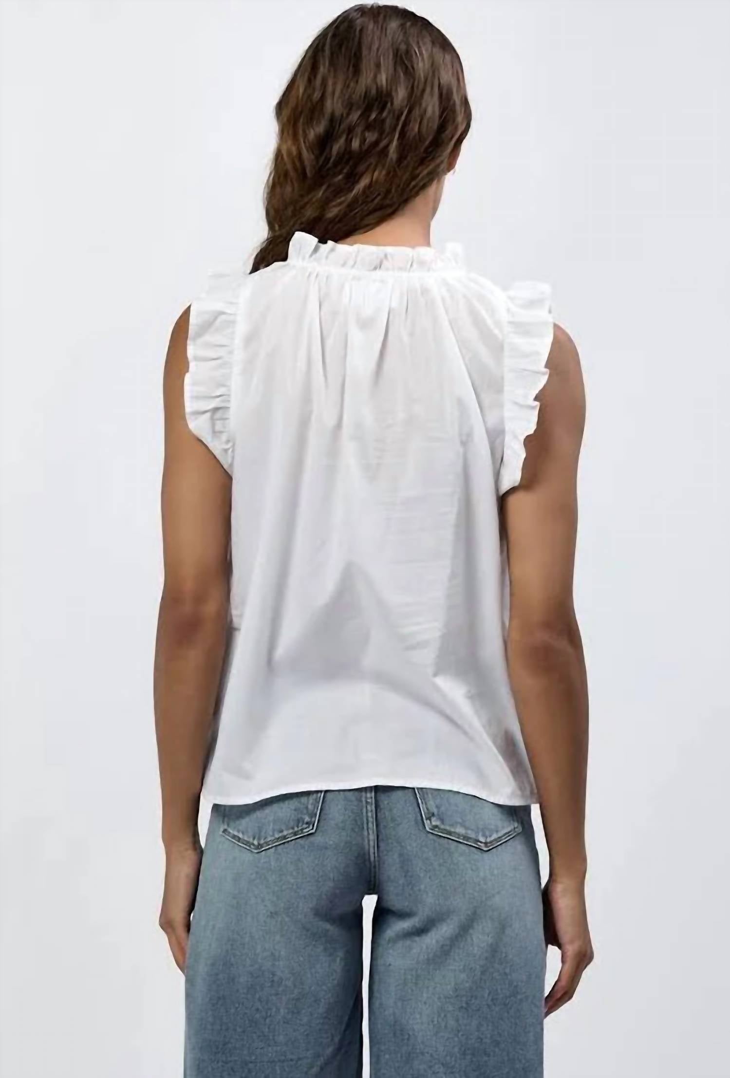 Introducing the Women's Benning Top by DEAR JOHN DENIM, a chic addition to your wardrobe perfect for any vacation. This sleeveless crop top is crafted from 100% cotton, offering a comfortable and breathable fit ideal for spring days. Featuring a playful ruffle sleeve and neckline, the solid white piece is designed with a flattering V-neck for a minimalist touch. Easy to care for, it requires a simple machine wash, gentle cycle, and can be tumble dried on a low setting.