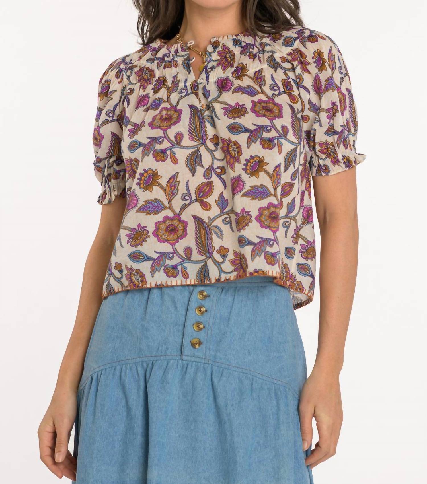 Elevate your spring wardrobe with the Daisy Short Sleeve Top by Elizabeth James The Label, adorned with floral embroidery in vibrant Ivory Cactus Flower. Crafted from breathable cotton, this top boasts a smocked front and yoke back, complemented by elastic sleeves with ruffle trim for a boho chic flair. The crewneck design is highlighted by contrast stitching and covered button details, offering subtle sophistication. Closure is pull-on style, with care instructions recommending hand wash and line dry for effortless maintenance.