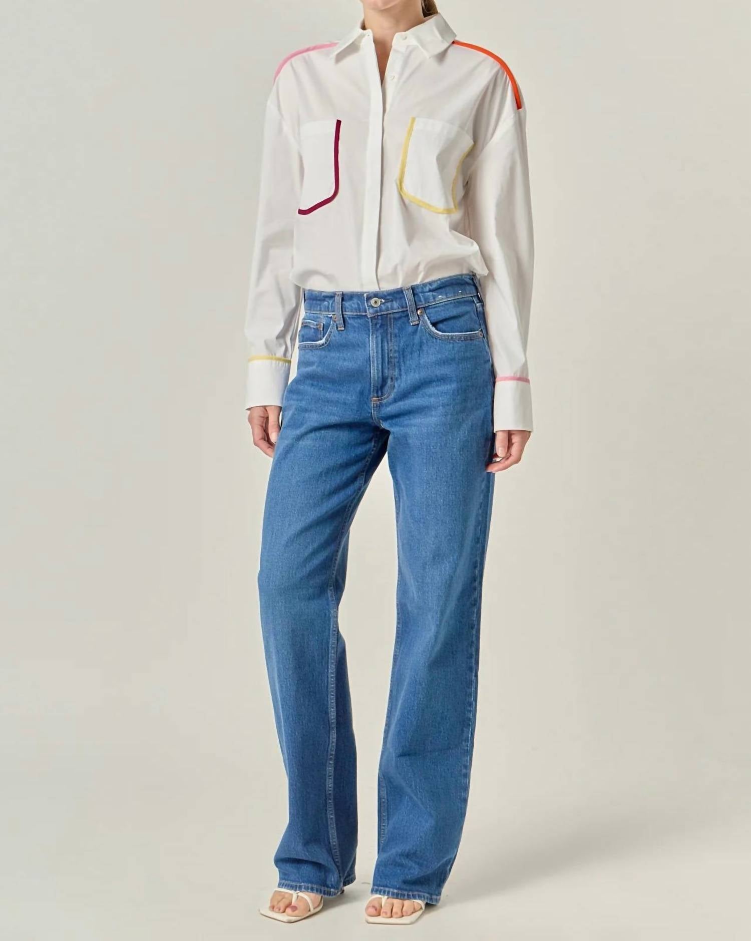 Introducing the Louise Binding Detail Shirt by English Factory, where classic style meets modern flair with a multicolor design. This collared button-down shirt features long sleeves with button cuffs and a striking colorblock binding for a bold contrast. Made from 65% Cotton, 32% Nylon, 3% Spandex, it includes front patch pockets for functionality. Care: Hand wash and line dry.