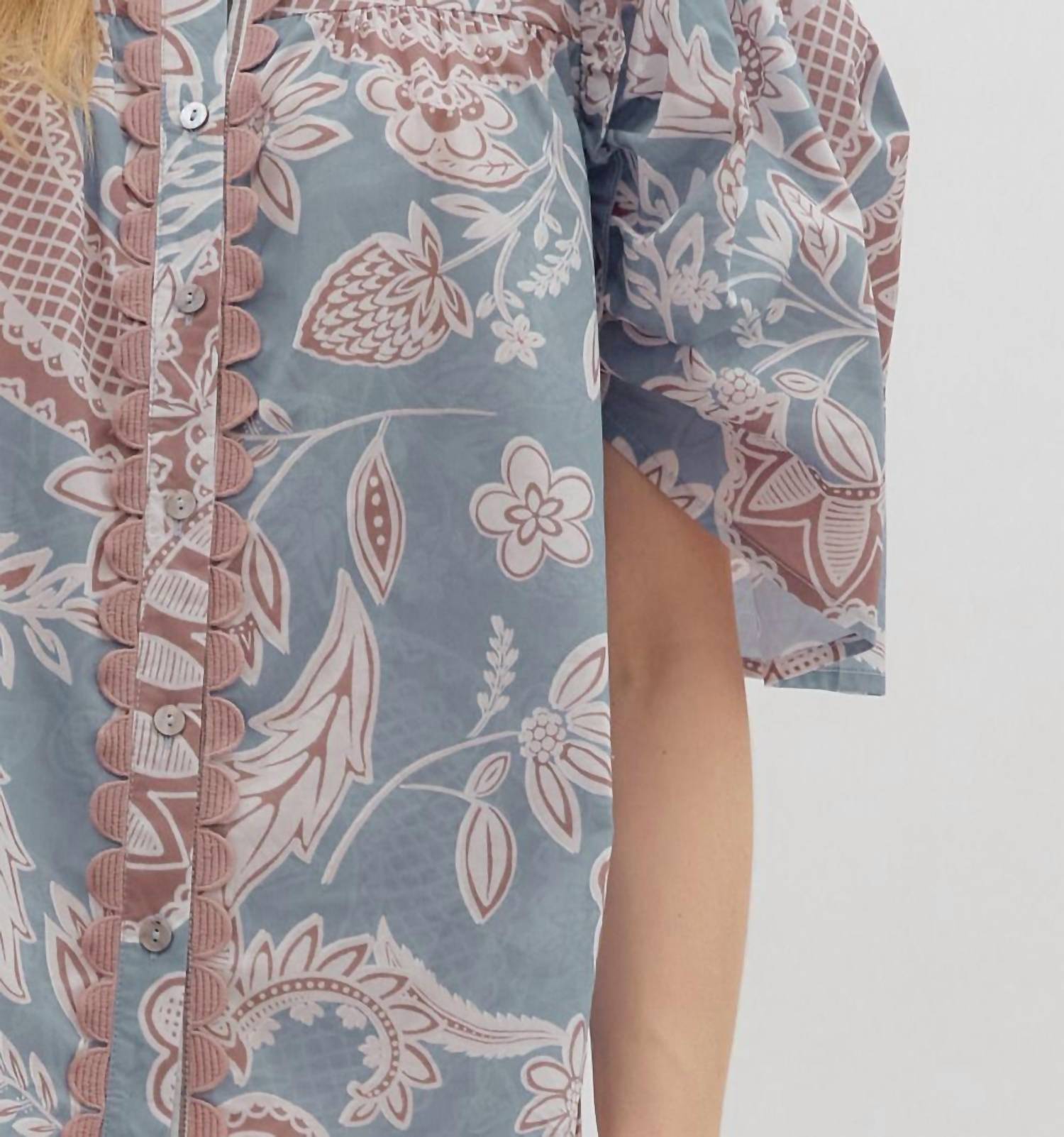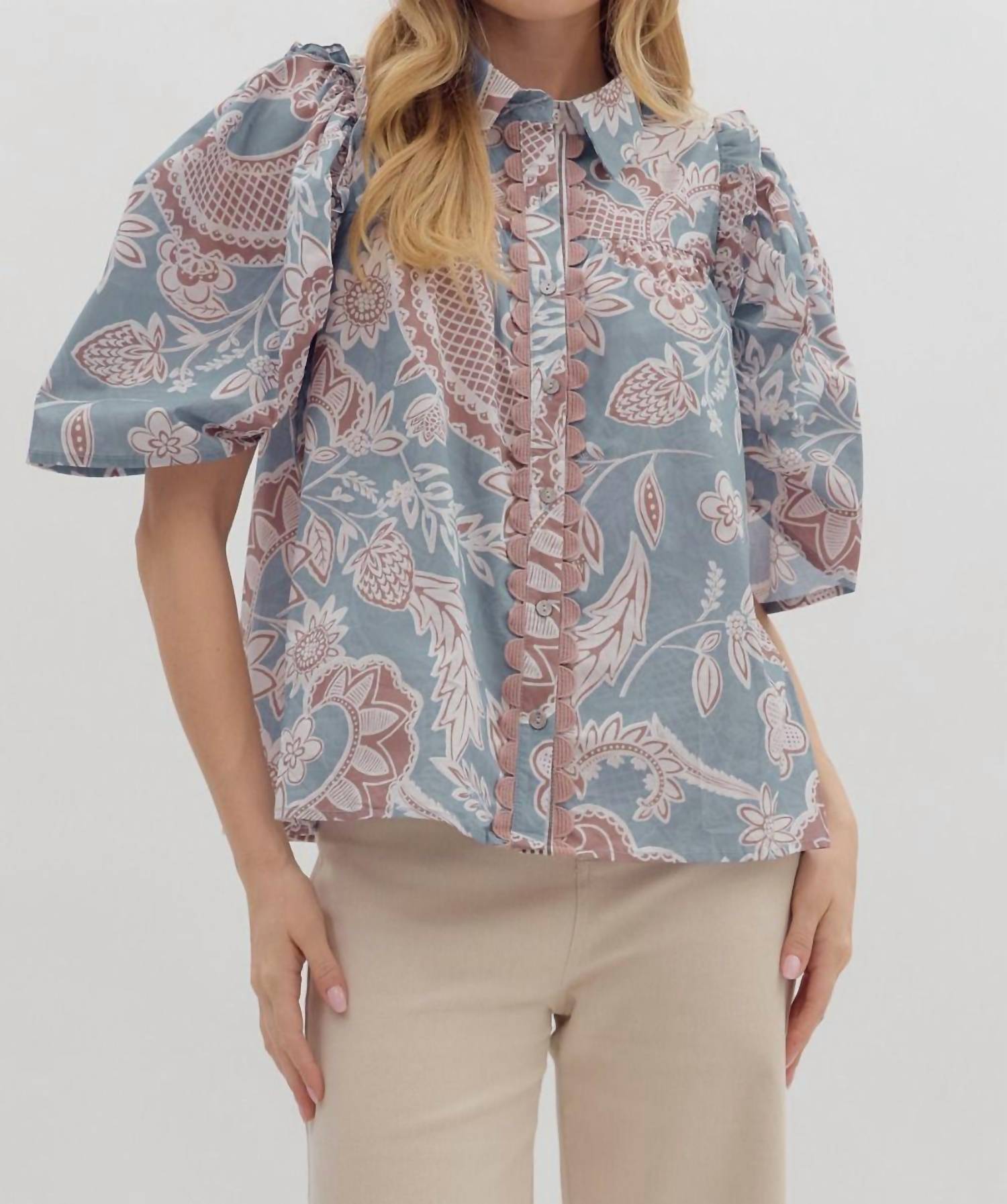This classic, short sleeve tee will be your go-to staple this season and beyond. Elevate your spring wardrobe with the Palo Alto Modern Paisley Top by Entro, a stylish choice for any occasion, including Thanksgiving gatherings or baby showers. Designed with elbow-length sleeves and crafted from a 100% cotton blend, this multi-colored blouse features a bold paisley pattern and classic collar with a button closure. Highlighting statement sleeves and a contrast scallop trim inset, this piece is both lightweight and unlined, perfect for layering or wearing solo. Care instructions recommend hand washing to maintain its chic appearance.