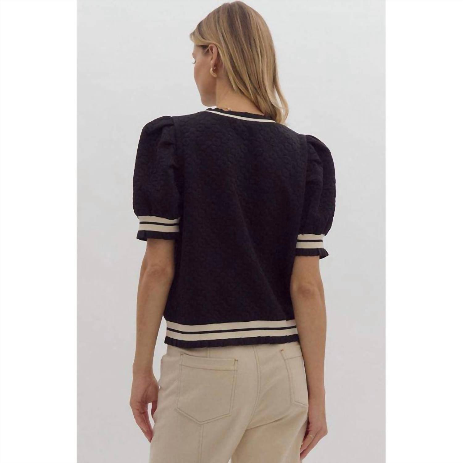 Introducing the Short Sleeve Floral Textured Top by Entro, a chic addition to your wardrobe in elegant black. Crafted from 100% polyester, this blouse features padded shoulders, elastic at the cuffs and waist, and a lightweight, non-sheer fabric. With its pull-on closure, this top provides a flattering, slimming look perfect for a vacation-ready ensemble. Available in sizes S(0-2-4), M(6-8), L(10), this piece is ideal for adding texture and style to your summer outfits.