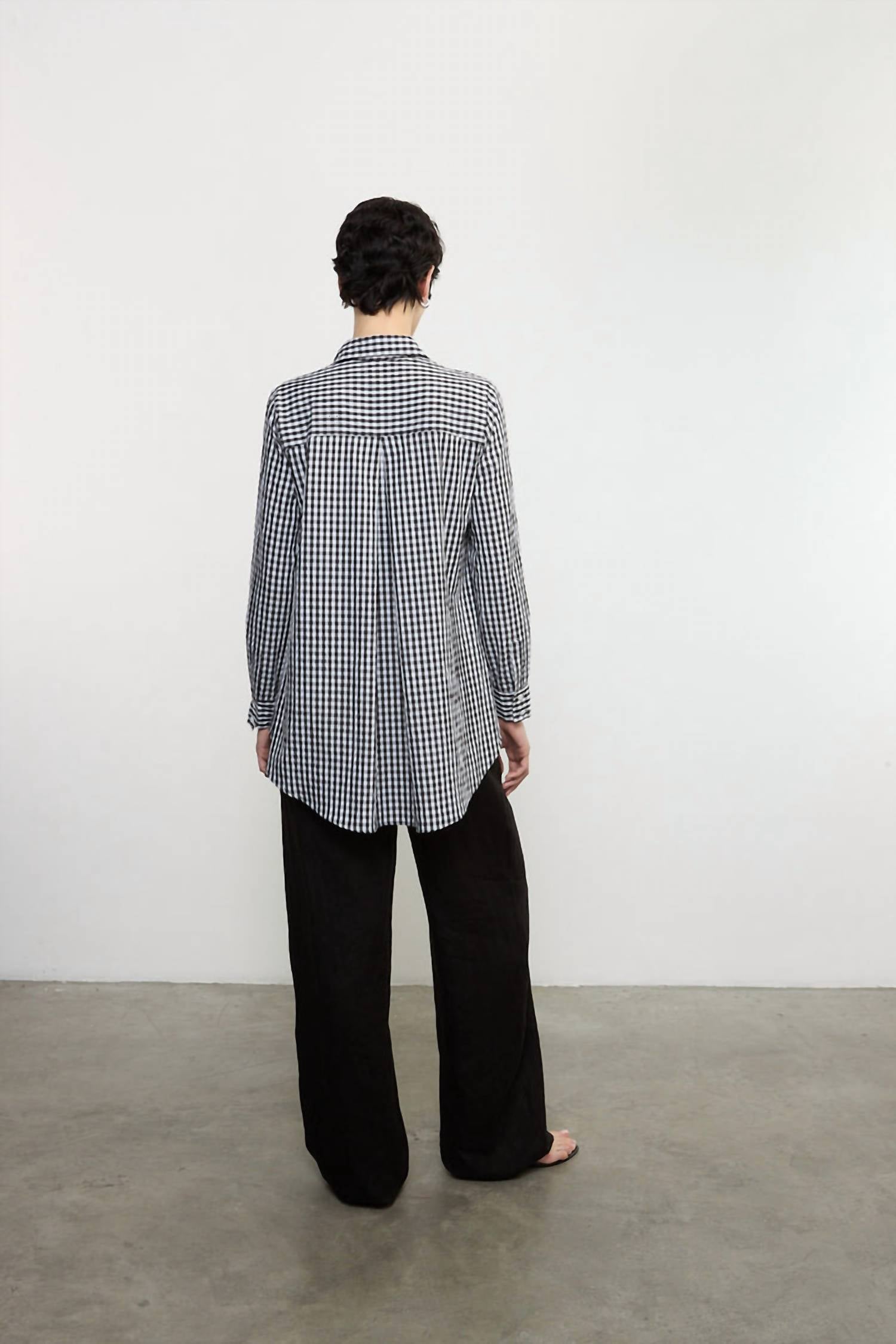 This button down shirt is comfortable yet polished. Introducing the Textured Gingham Shirt by Enza Costa, a chic addition to vacation and 90s fashion wardrobes. This piece features long sleeves, a classic collar, and a functional chest pocket. Composition: 71% Cotton, 29% Polyester. Made in the USA with a button closure. Care: Dry clean and steam only.