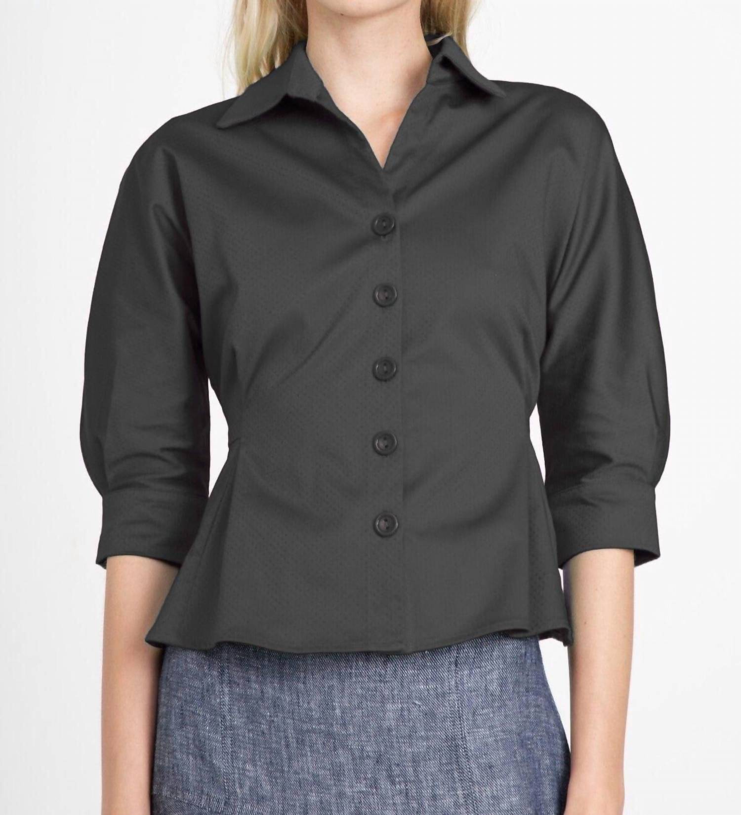 Com mangas dolman três quartos e cós peplum, esta peça em mistura de algodão é habilmente confeccionada em Los Angeles, EUA. Adote o charme clássico da gola estilo camisa e do fecho de botão para um acabamento elegante. 97% algodão, 3% elastano. Lavagem à mão. Comprimento da peça: 63 cm.