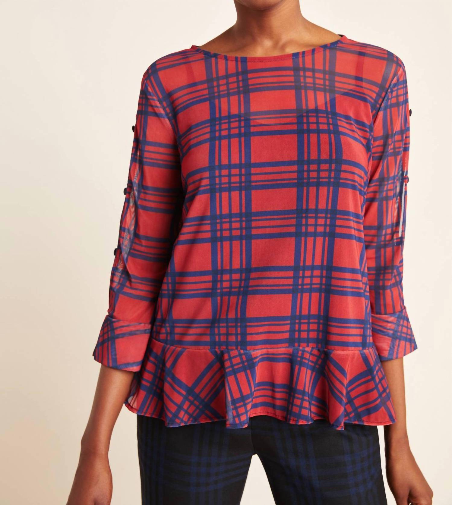 Great fit, cute design, soft fabric. You'll love everything about this long sleeve tee. Elevate your fall wardrobe in the vibrant Rachel Island Plaid. Features a stylish boatneck and three-quarter sleeves, complete with side slit detail and matching buttons for added flair. Boasts a flounced hem. Made from 100% polyester. Offering a lightweight, barely-there feel. Closure is effortless with pull-on styling.