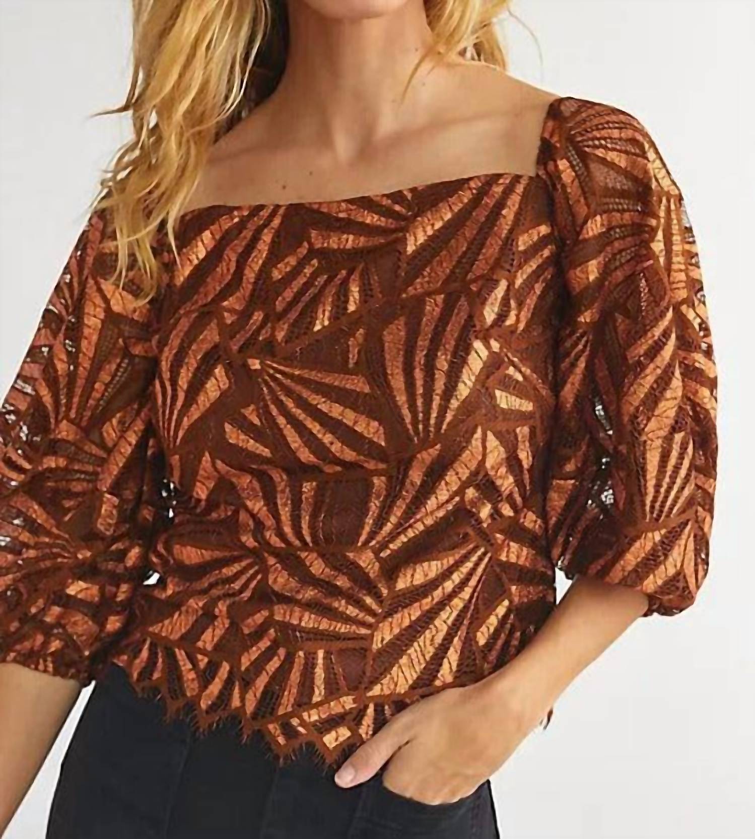 Pair this with your favorite jeans and slides for your next girls night out. Crafted with three-quarter puffed sleeves and a striking copper metallic geometric lace, perfect for holiday parties or a chic night out. Made from 83% Polyamide, 10% Metal, and 7% Polyester. Features a cropped fit with an off-shoulder design, fully lined for ultimate comfort. Tailored with a rear zip closure, boasting a garment length of 22.5 inches. Easy to maintain, it’s machine washable for your convenience.