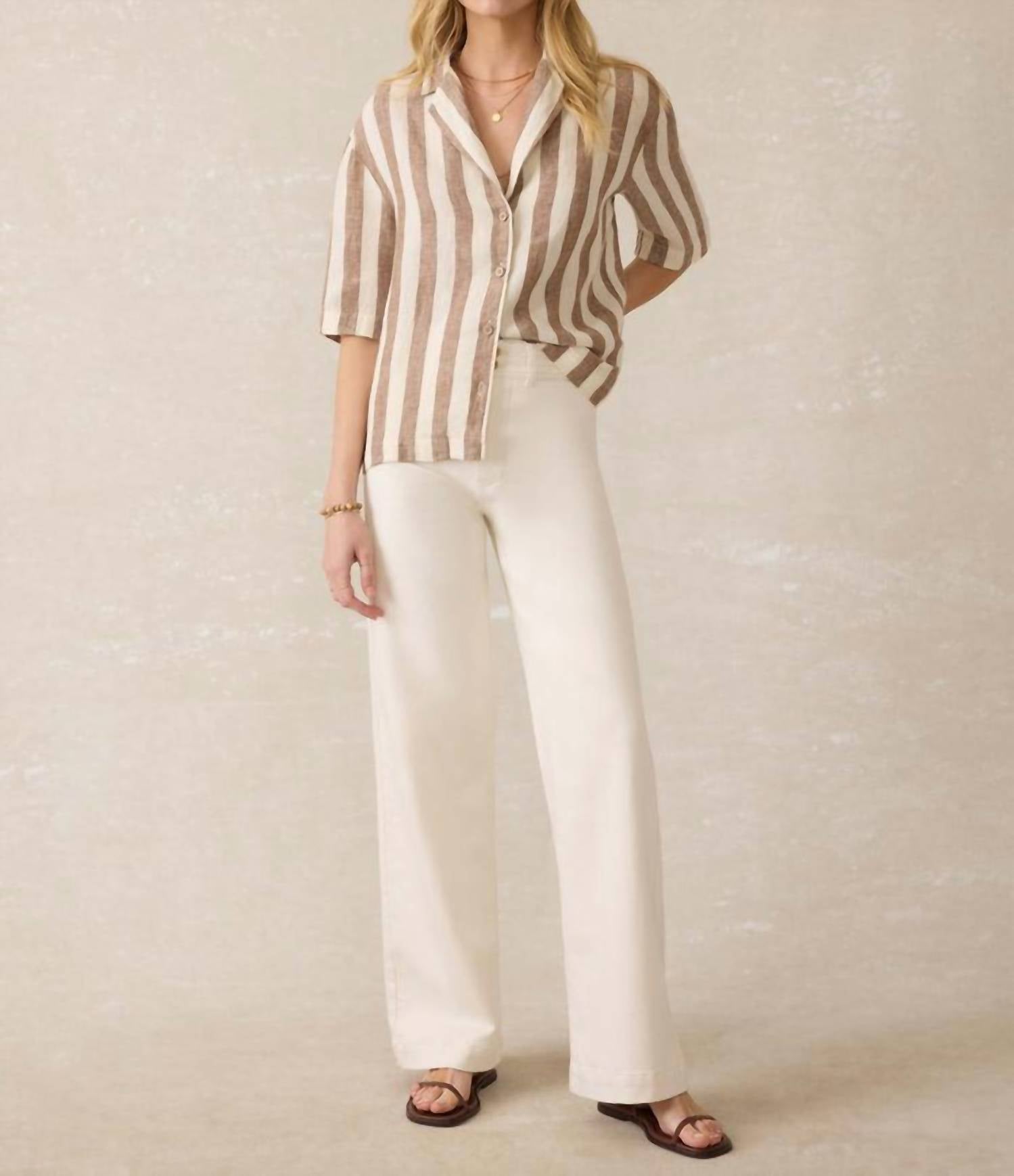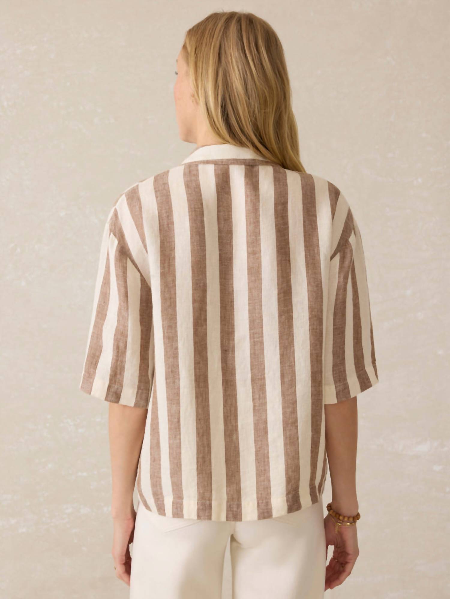 Perfectly tailored and soft to the touch. Elevate your summer wardrobe with the Palma Linen Camp Shirt in Cocoa Beach Stripe from Faherty, perfect for a minimalist vacation vibe. Featuring short sleeves and a collared neck, this piece ensures style with comfort in a lightweight, non-stretch linen weave. Crafted from 100% linen, it boasts a button closure and is imported from China, measuring 23.25 inches from shoulder in size XS. For maintenance, simply machine wash cold.