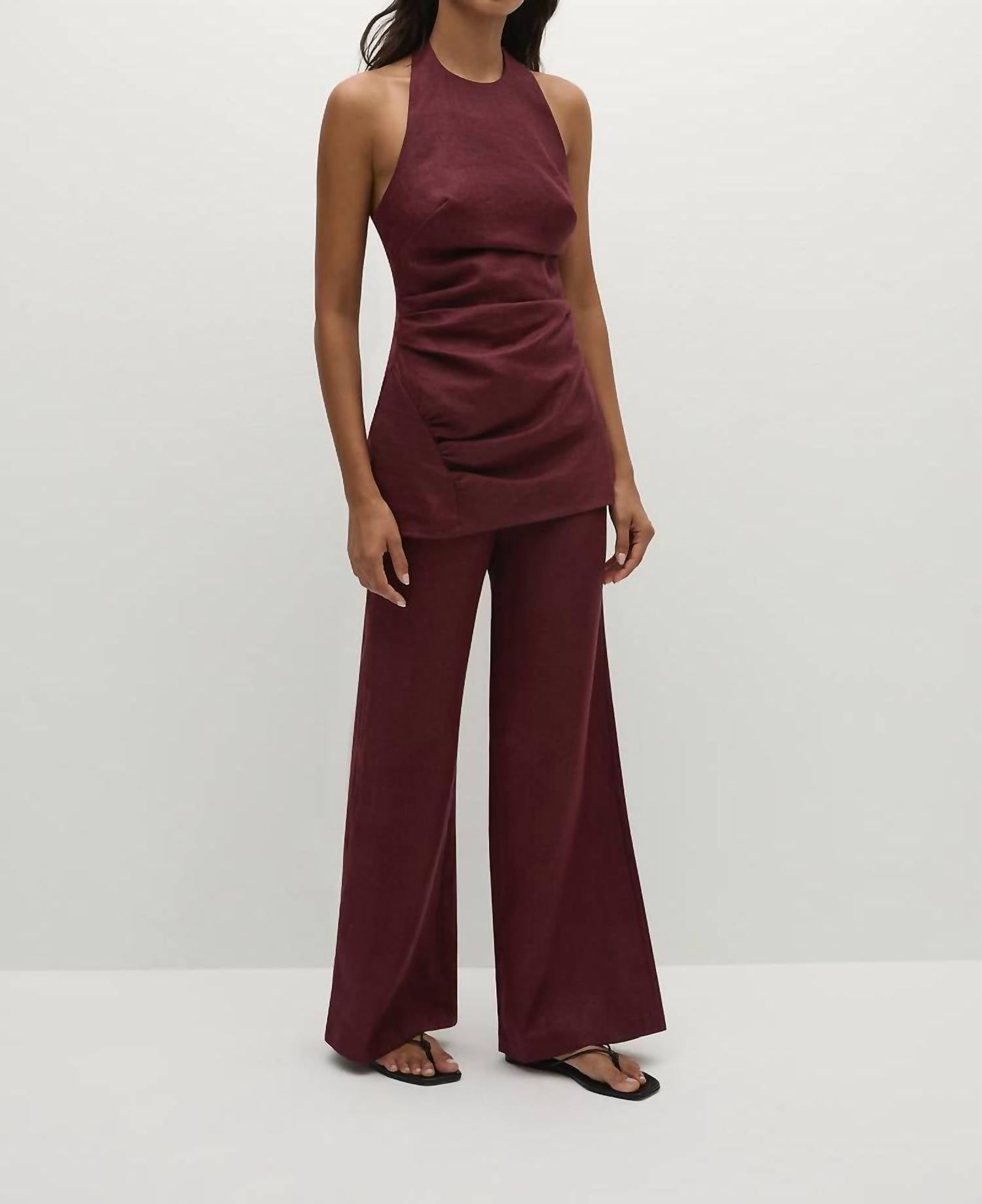 Meet the Fia Halter Top by FAITHFULL THE BRAND, a sophisticated addition to your minimalist fall wardrobe. Crafted from 100% European Flax® linen in a striking bordeaux color, this sleeveless top offers a flattering silhouette with its gathered details and a convenient shirred back panel for extra stretch. Designed to be long in length and fully lined with cotton, it features a halter neckline with a back clasp and a side zip opening. To keep it looking its best, simply hand wash and lay flat to dry.