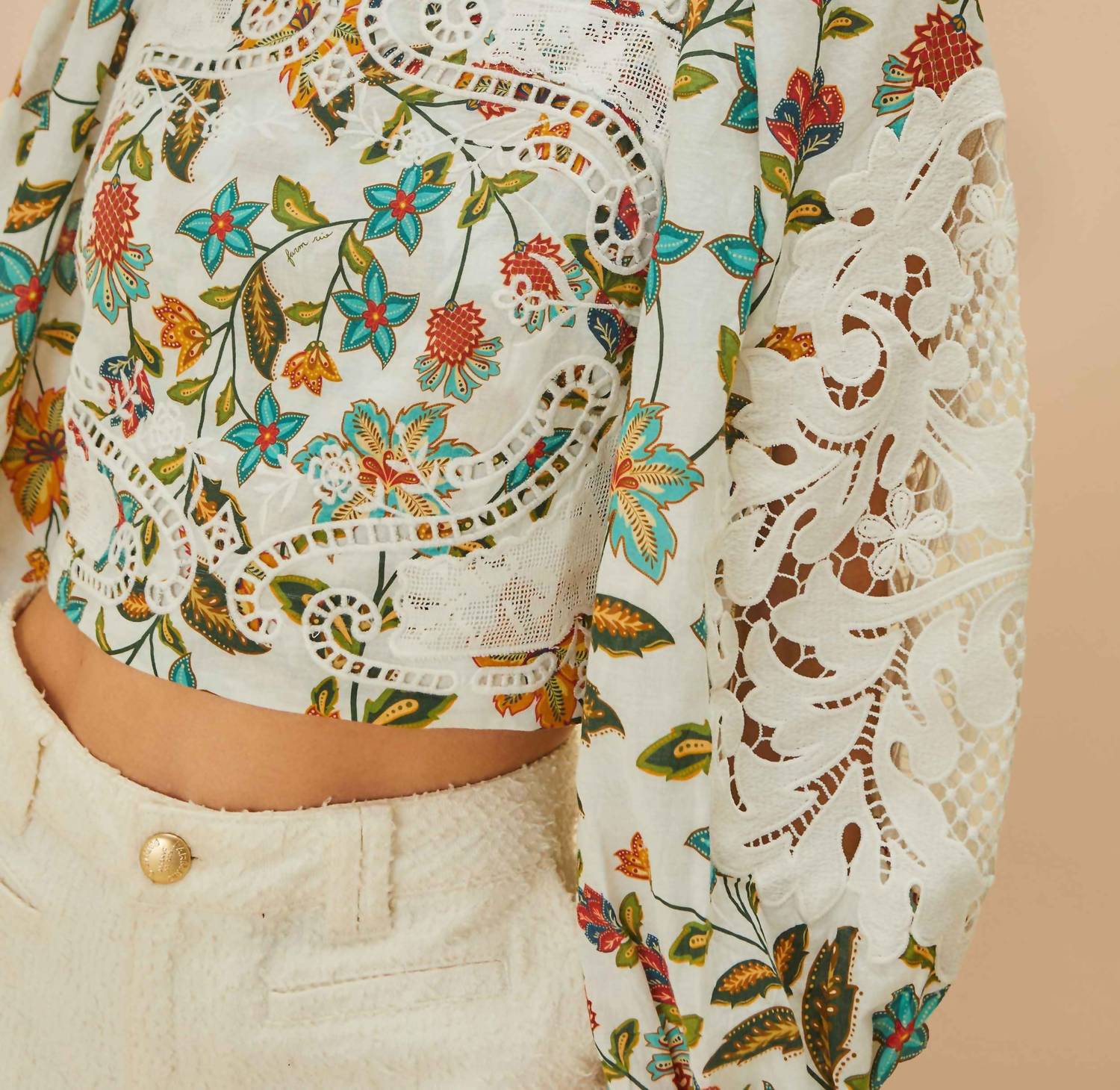 A timeless blouse that will never go out of style. Embrace the playful charm of the Off-White Botanicals Lace Blouse from FARM Rio. This delicate piece features a square neckline, adorned with vibrant floral patterns that dance across the fabric. The blouse's enchanting lace details and airy balloon sleeves evoke a sense of whimsical elegance, making it a perfect blend of warmth and style. Add it to your wardrobe for a touch of botanical delight.