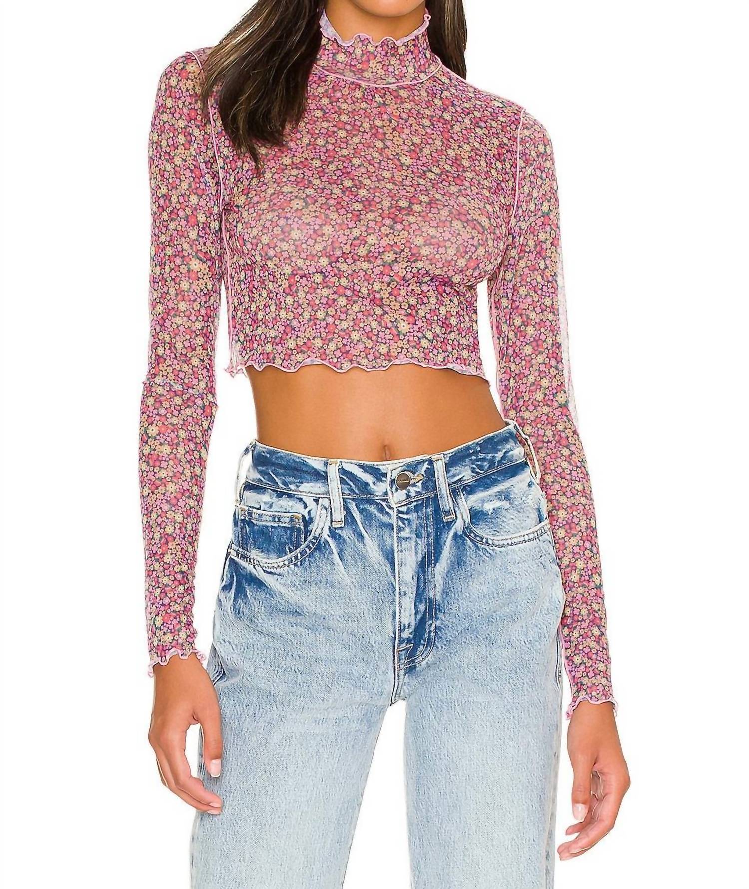 Show a little skin in this cute and casual crop top. Introducing the Nadia Crop Top by For Love & Lemons, a chic, sheer mesh design perfect for any wardrobe. This striking piece comes in a delicate pink hue with a floral pattern and features long sleeves and a fashionable turtleneck for a sophisticated touch. Made from a nylon blend (95% nylon, 5% spandex), it boasts a modern lettuce hem and an easy pull-on closure. Crafted in China, it requires dry cleaning to maintain its boho chic allure.