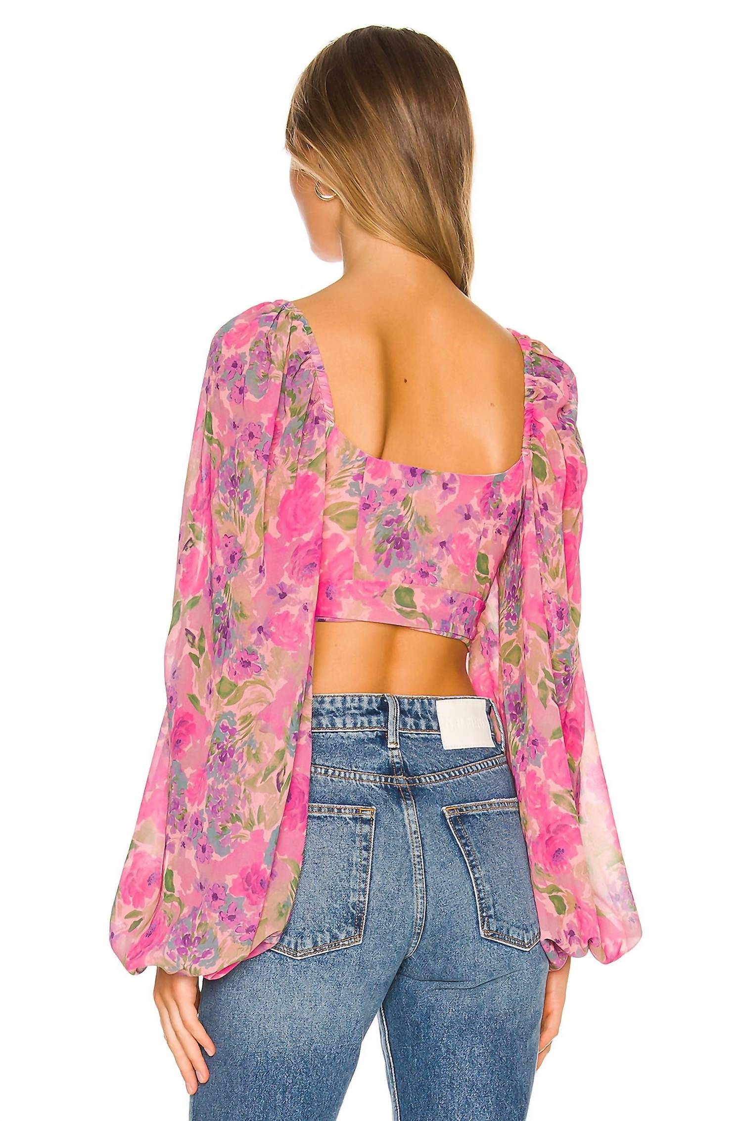 Show a little skin in this cute and casual crop top. Embrace a boho chic style with the TRISHA CROP TOP by For Love & Lemons, perfect for spring vacations and Thanksgiving gatherings. This floral beauty is designed with long blouson sleeves and cinched cuffs for a feminine touch. Made from 100% recycled polyester chiffon, it features a sweetheart neckline and a flattering gathered, pleated waist. The hidden side zipper closure adds functionality, while for care, dry cleaning is recommended.