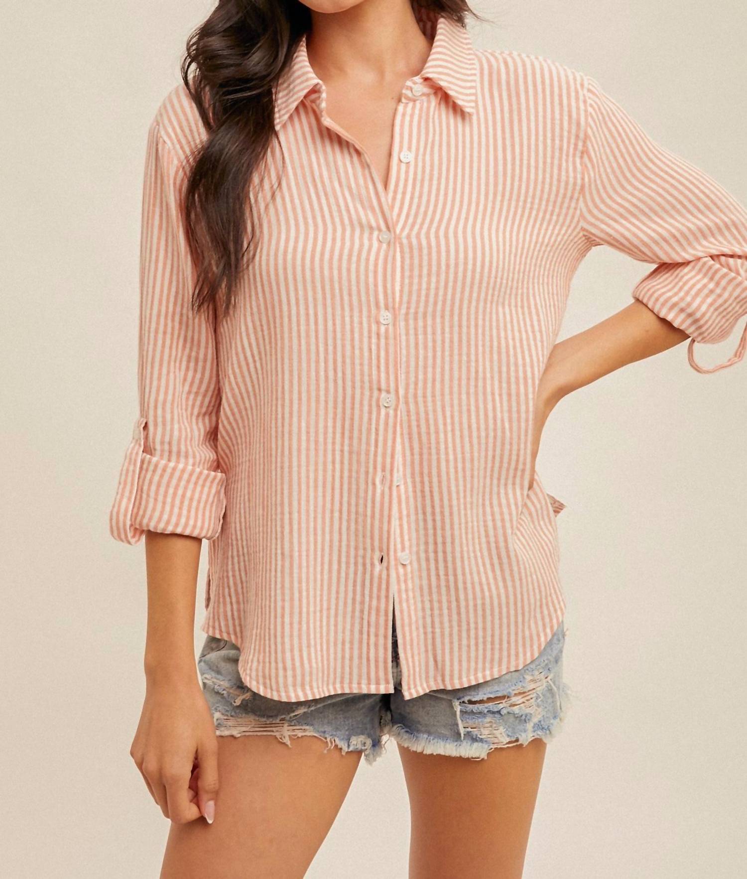 A classic button down shirt that will never go out of style. The Callie Oversized Stripe Button Down Shirt by Hem & Thread combines classic style with an easygoing fit. Crafted from 100% cotton, this peach-hued shirt features long sleeves that can be adjusted with a rolled cuff and button loop. Its button closure accentuates the collared neckline, while the oversized fit offers comfort and versatility for a spring dinner party. Bust measurements range from 43" to 47", with lengths varying from 27" to 28". The shirt is machine washable, ensuring easy care for a timeless wardrobe staple.