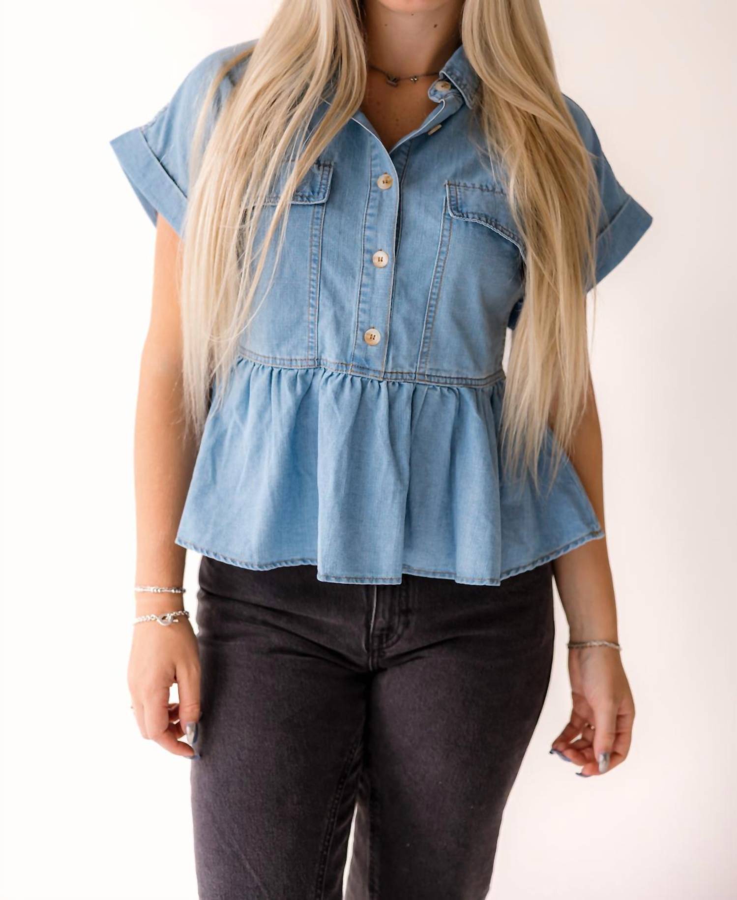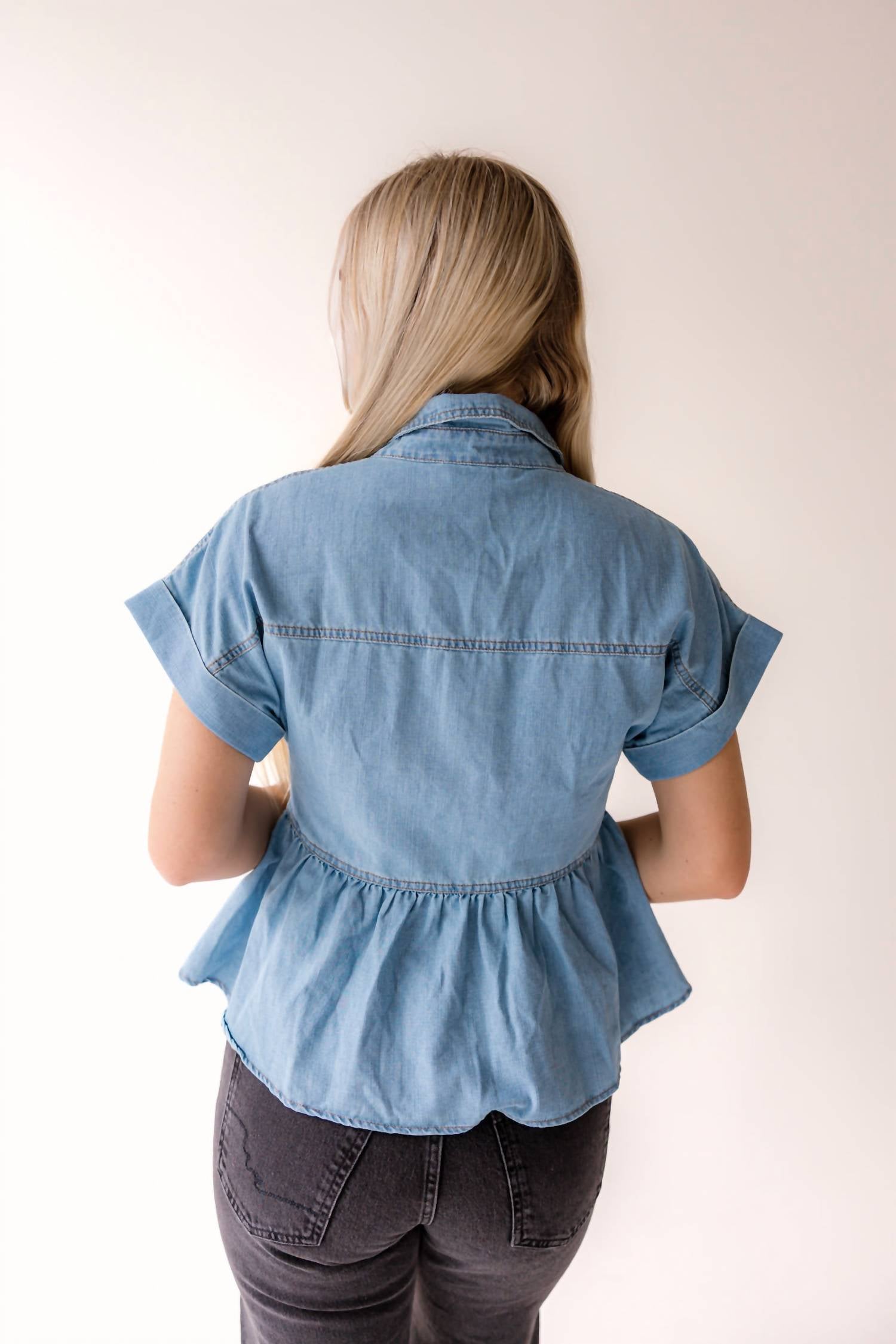Pair this with your favorite jeans and slides for your next girls night out. Discover the Jenny Button Down Babydoll Top by In February in a refreshing Washed Denim hue, perfect for summer and vacation outings. This women's blouse features cap sleeves and a playful collared neckline that embodies the breezy charm of 90s fashion. The relaxed, flowy fit offers carefree style, enhanced by functional pockets and a solid pattern. Closure: Button Closure. Model is wearing a size small (5'8" height, 33.5" bust, 28.5" waist, 40" hip).
