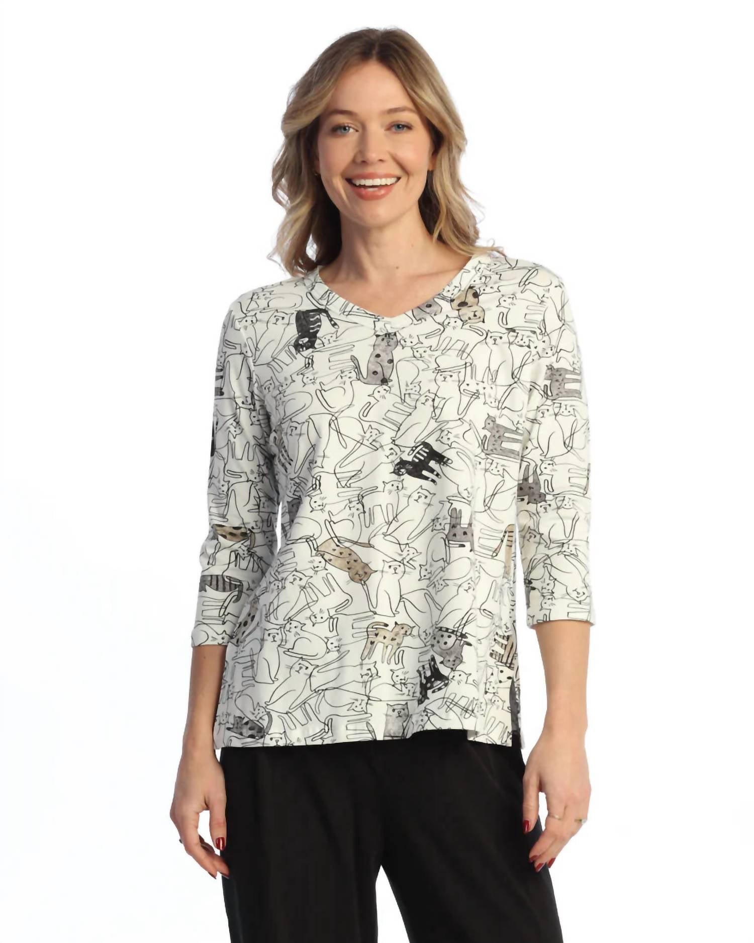 Discover the versatile charm of this tunic blouse, designed with both layering and standalone wear in mind. Its flattering silhouette and stylish details make it a closet essential. Introducing the Purrfect V-neck Top by Jess & Jane, a playful and comfortable addition to your summer wardrobe. This multi-colored tunic features a chic animal pattern with a V-neckline and three-quarter sleeves, offering a striking maximalist trend appeal. Crafted from approximately 95% cotton and 5% spandex, it is made in the USA and designed for easy wear with a convenient pull-on closure. Care for this high-quality piece is simple with machine wash in cold water and line dry instructions.