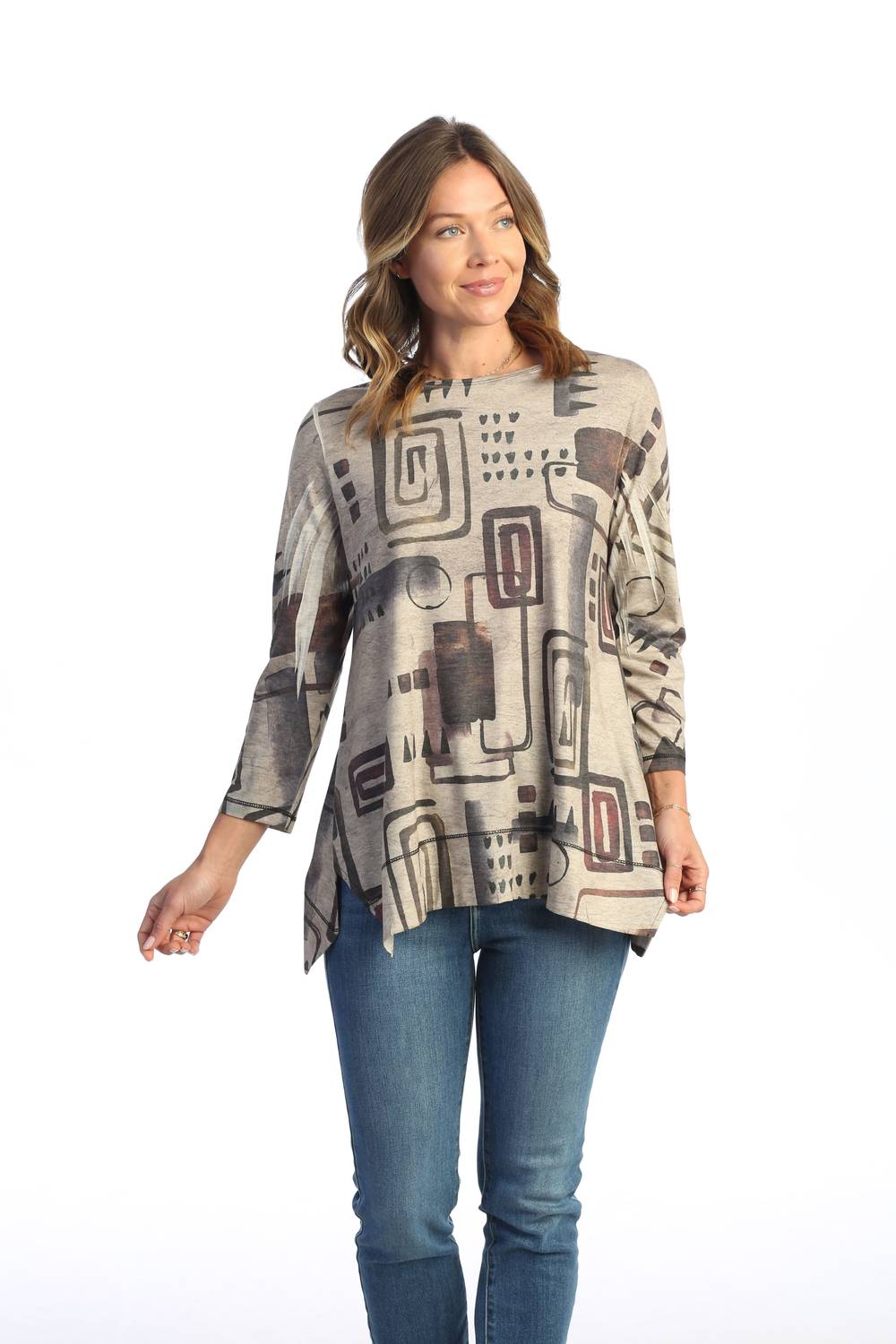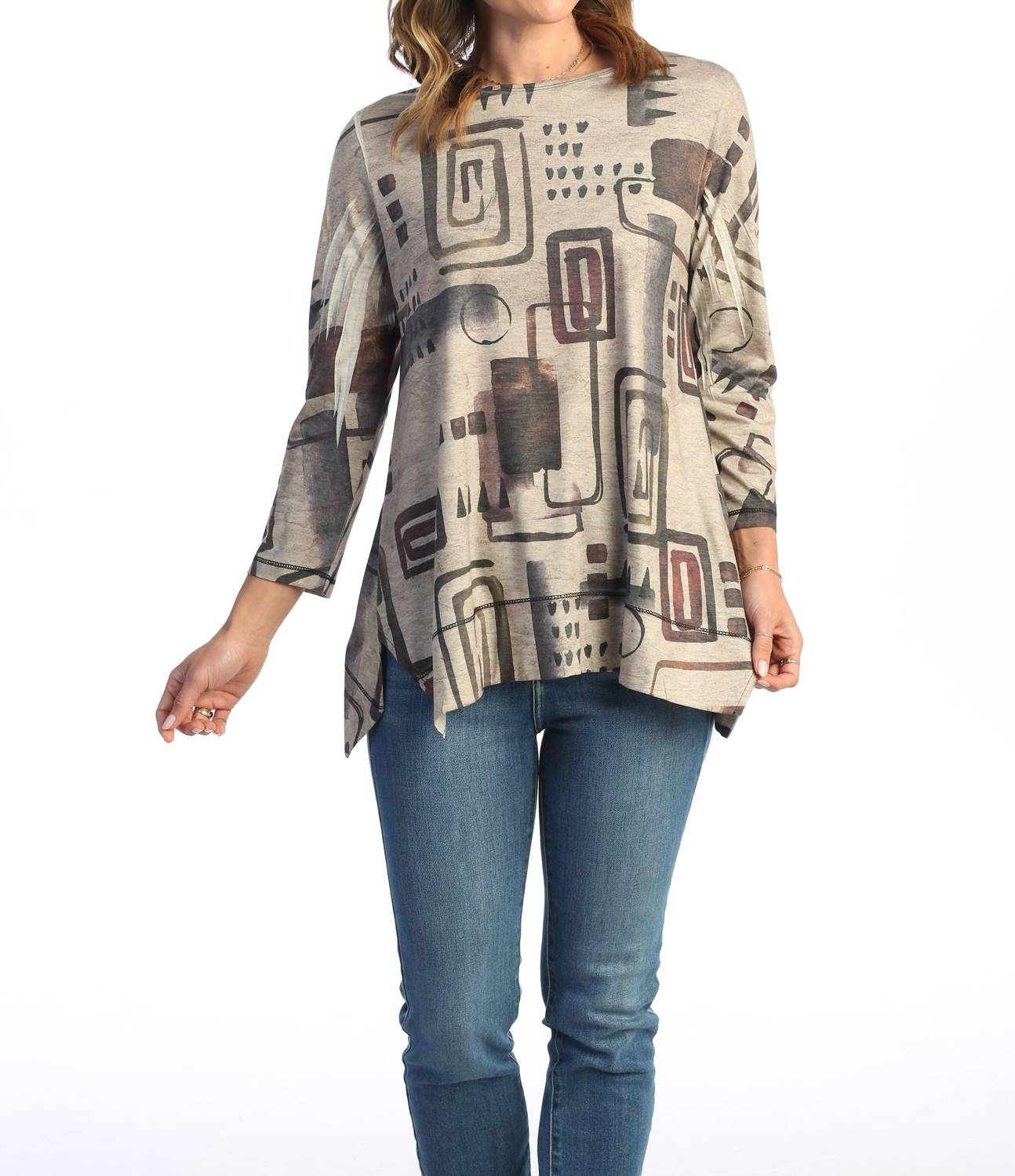 Embrace boho chic style with the Women's Maze Diagonal Side Slit Top by Jess & Jane in a vibrant multi-color. This tunic features a three-quarter sleeve length and a round neckline, complemented by wide hems and graphic sublimation prints. A comfortable fit is ensured with its stretchy, silky fabric made from 87% Polyester, 10% Rayon, and 3% Spandex. Originating from the USA, it is machine washable and designed with a pull-on closure, perfect for a spring vacation.