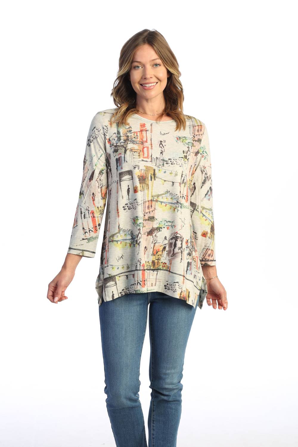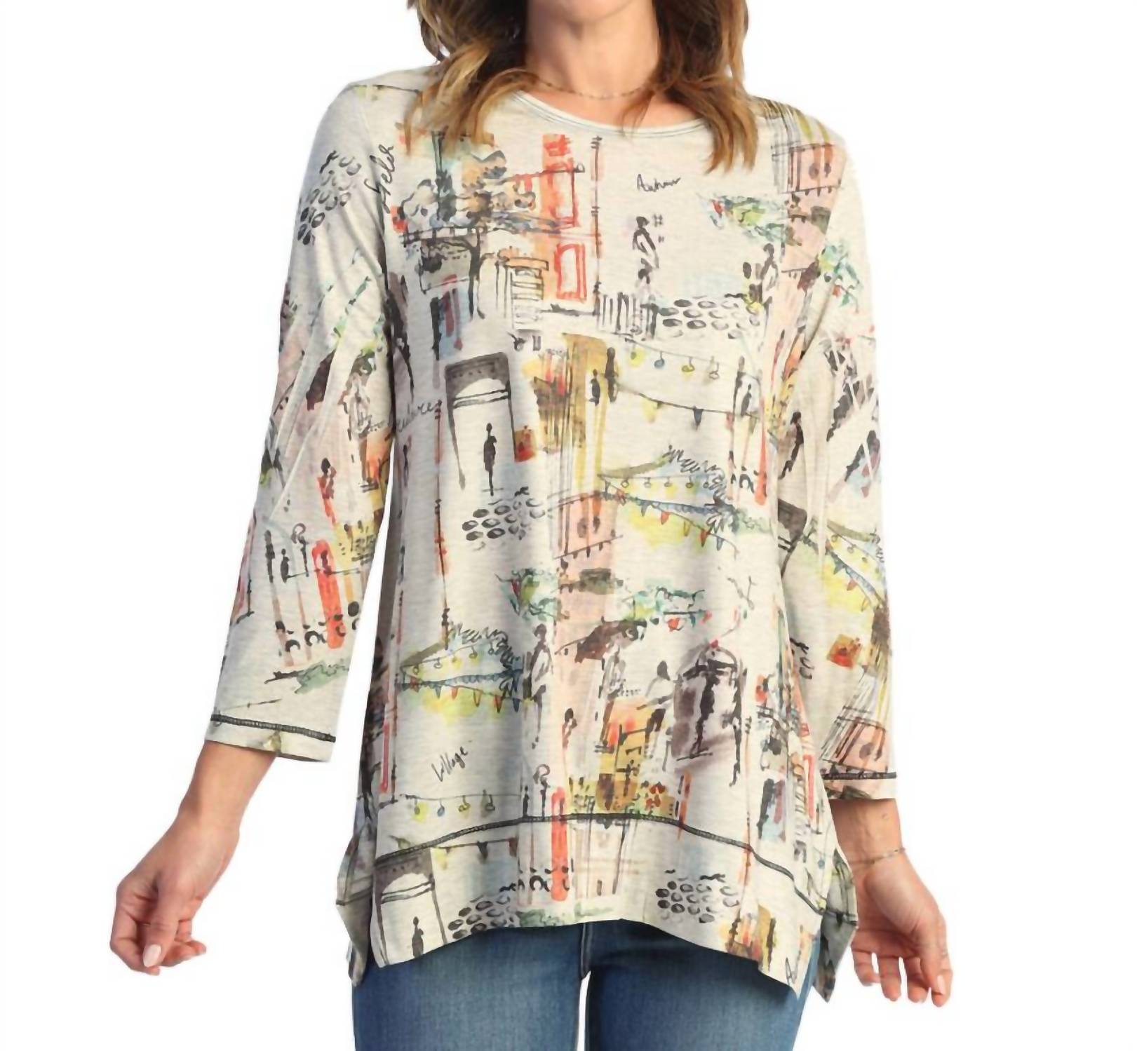 Introducing the Women's Paseo Diagonal Side Slit Top by Jess & Jane, a unique piece that combines style and comfort in a sublimation print. Featuring three-quarter sleeves with a round neckline and diagonal side slits, this tunic offers a wide hem for added flair. Crafted from 87% Polyester, 10% Rayon, and 3% Spandex, the fabric is smooth and silky yet not shiny and boasts stretchy, non-wrinkle comfort. Made in the USA, this pull-on top is ideal for a boho chic vacation look and is machine washable for easy care.