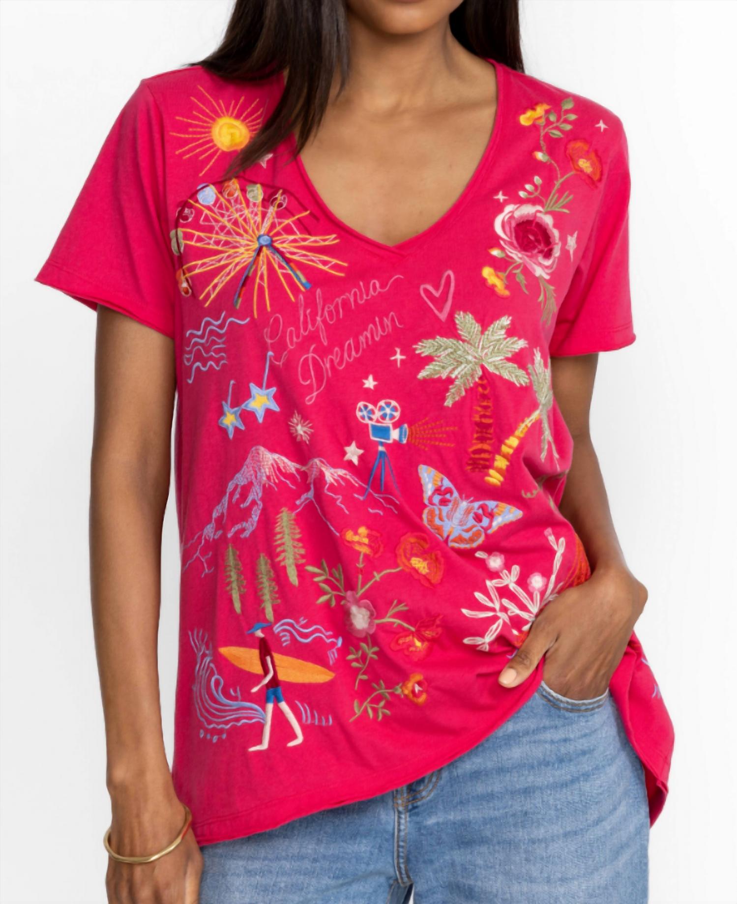 This classic, short sleeve tee will be your go-to staple this season and beyond. The California Everyday Tee by Johnny Was brings the vibrant spirit of the Golden State into your wardrobe with its playful placement embroidery in a rich raspberry hue. Featuring short sleeves and crafted entirely from 100% cotton, this tee offers a comfortable pull-on style perfect for vacation wear. Made with meticulous attention to detail, the tee measures 42 1/2" in bust and 25 1/2" in length for size medium. Care is simple with machine wash cold instructions and low tumble dry, ensuring this tee remains a favorite for summers to come.