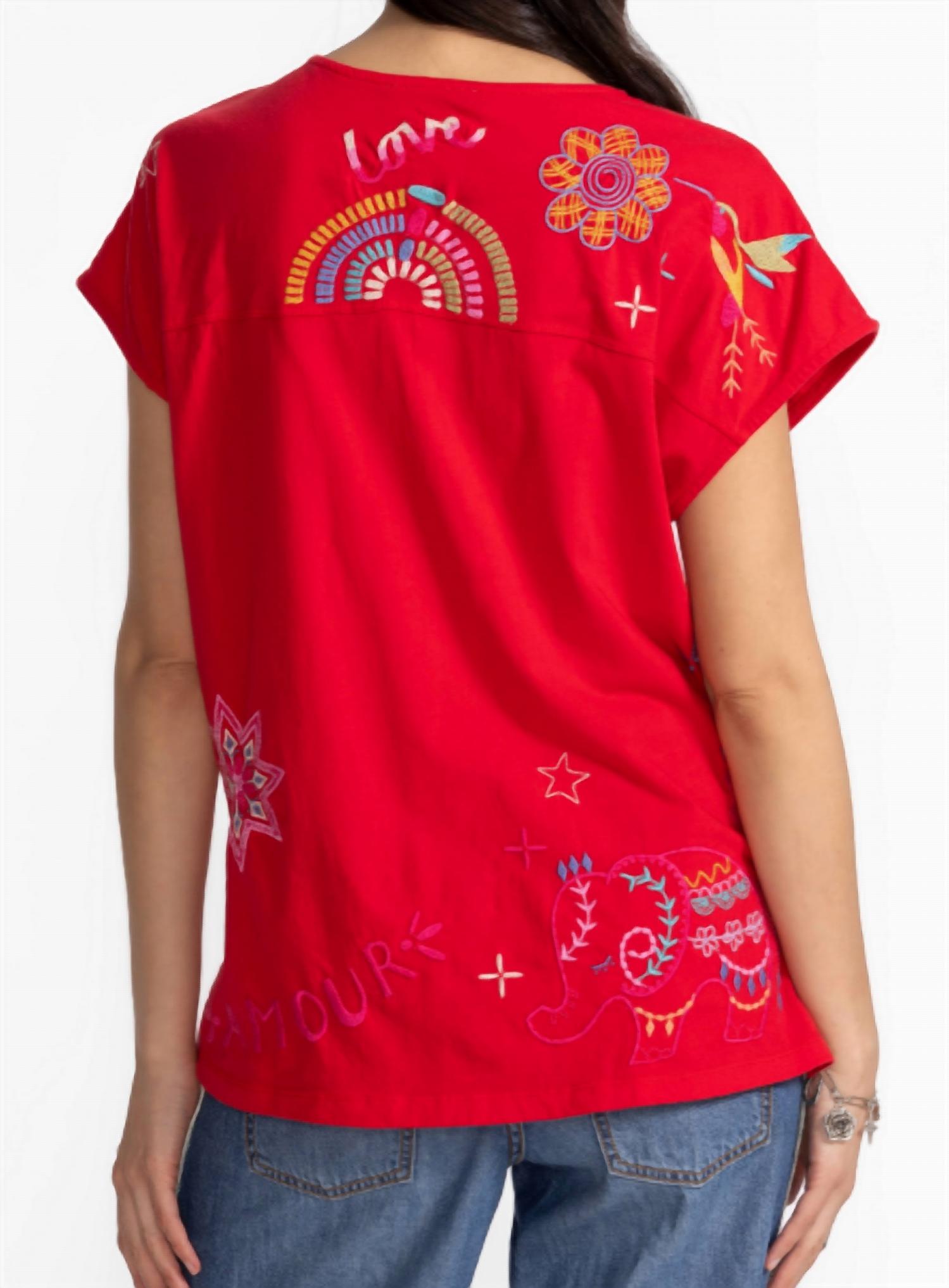 This classic, short sleeve tee will be your go-to staple this season and beyond. Elevate your summer wardrobe with the Johnny Was Easy Paneled V-Neck Tee, a standout piece in white with colorful embroidered graphics. Featuring short dolman sleeves and a V-neckline, this tee is artfully crafted from 100% cotton with detailed paneling for a unique seamed look. Closure: Pull on. Care: Machine wash cold, only non-chlorine bleach when needed, tumble dry low, warm iron. Measurements for size Medium include a bust of 45 1/4" and a front length of 26".