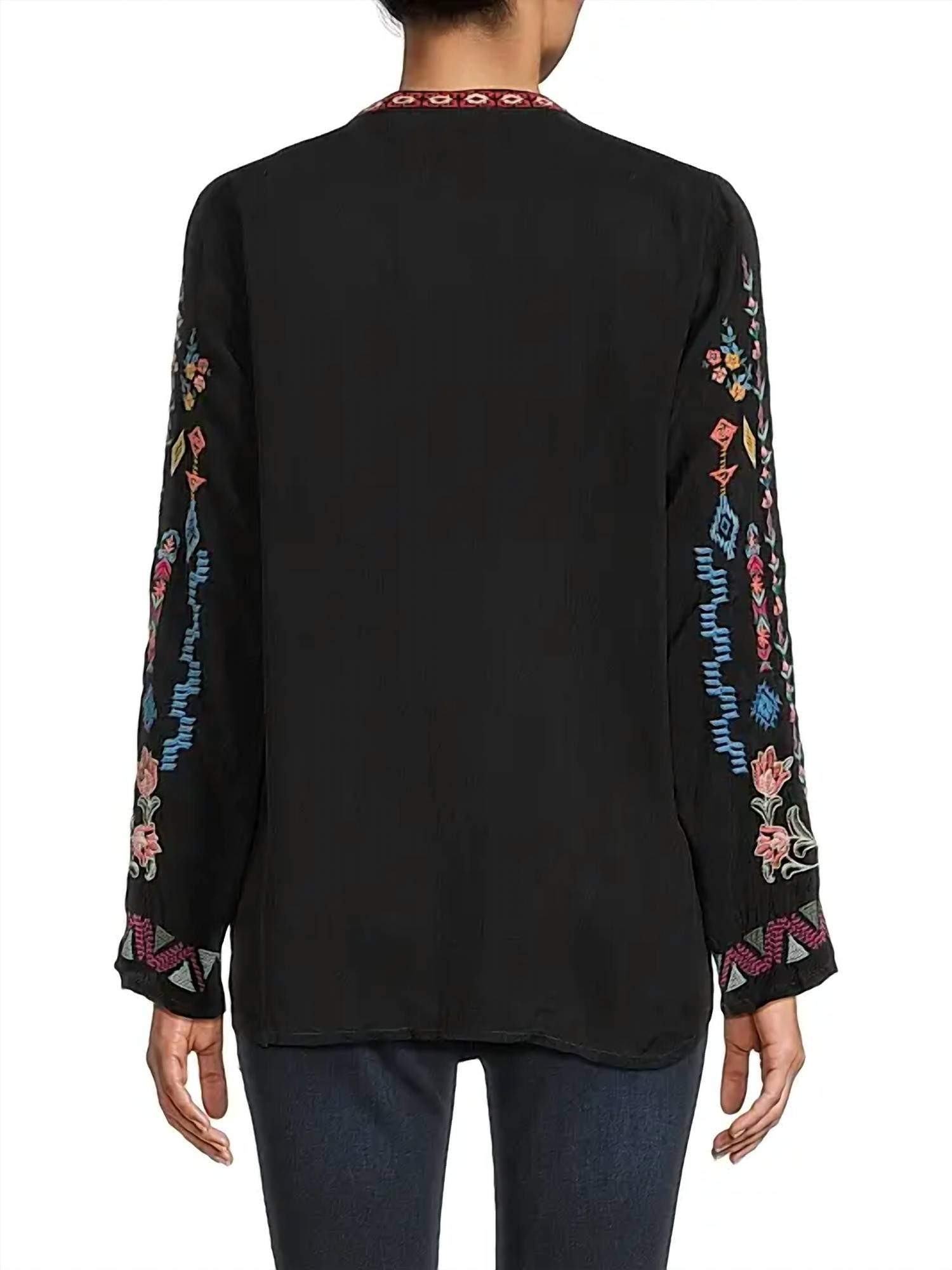 Discover the versatile charm of this tunic blouse, designed with both layering and standalone wear in mind. Its flattering silhouette and stylish details make it a closet essential. Introducing the Johnny Was Margot Blouse in a vibrant Sarah color scheme, perfect for adding a splash of personality to your wardrobe. This long sleeve tunic is patterned with bold, embroidered details and crafted from 100% Cupro, offering a lightweight and comfortable fit. It features a split V-neckline and side slits with a button closure for a casual, relaxed vibe. Care for this piece with a machine wash in cold water, and dry it on low heat. Measurements for size Medium include a bust of 46 inches and a front length of 27 inches.