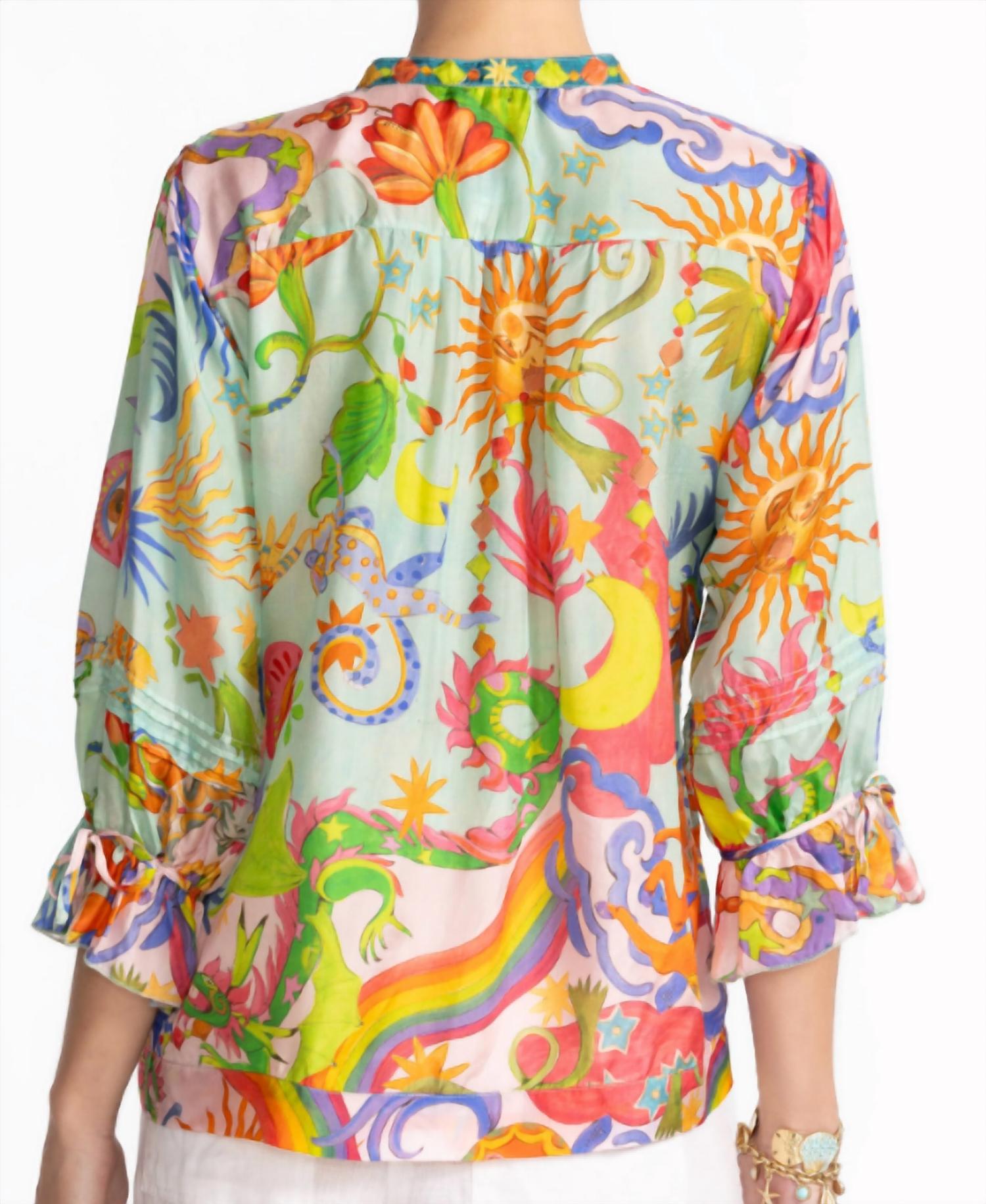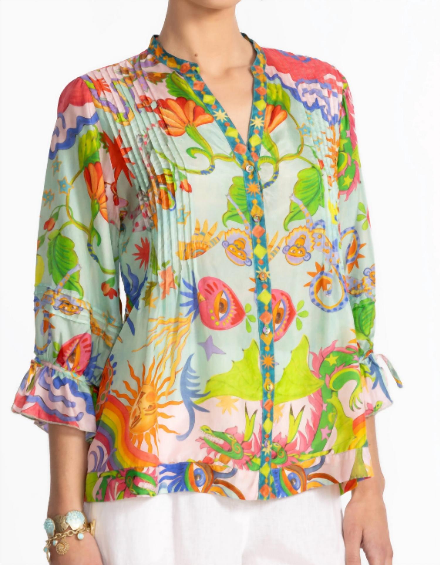 A versatile blouse that works from desk to dinner! Elevate your wardrobe with the Vacanza Blouse by Johnny Was, featuring eye-catching graphic patterns in the vibrant Kayla color. This women's maximalist summer blouse boasts three-quarter ruffled sleeve hems and a flattering V-neckline. Crafted from 100% sumptuous silk, this button-down piece measures 26 1/2" in front length for a size Medium, with a bust of 44 1/2". Care for this vacation-ready blouse by turning inside out and hand washing gently; lay flat to dry and use a light steam iron if necessary. Model is wearing a size Small and is 5'10" tall.