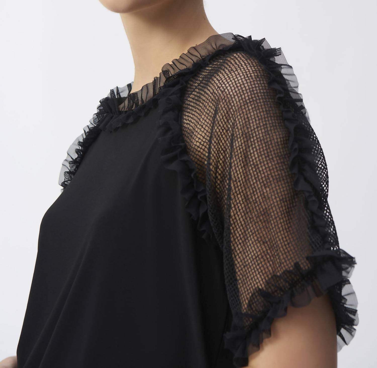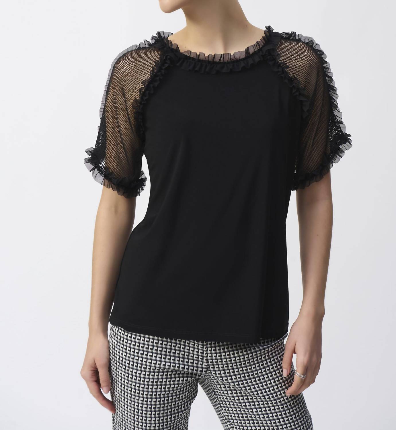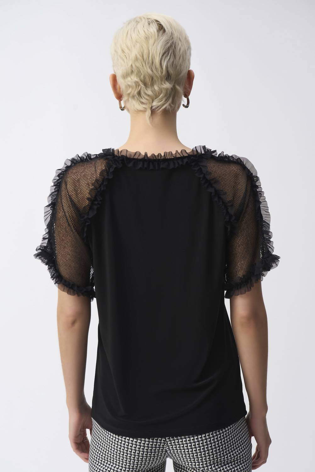 Pair this with your favorite jeans and slides for your next girls night out. Elevate your wardrobe with the Silky Knit and Mesh Top by Joseph Ribkoff, a chic and romantic piece in classic black. Crafted with short puff sleeves and a fitted hip-length design, it features a luxurious blend of 96% polyester and 4% spandex. This women's blouse is a pullover style, offering a seamless and elegant fit. Length: 24 inches. Hand wash and lay flat to dry to maintain its exquisite details.