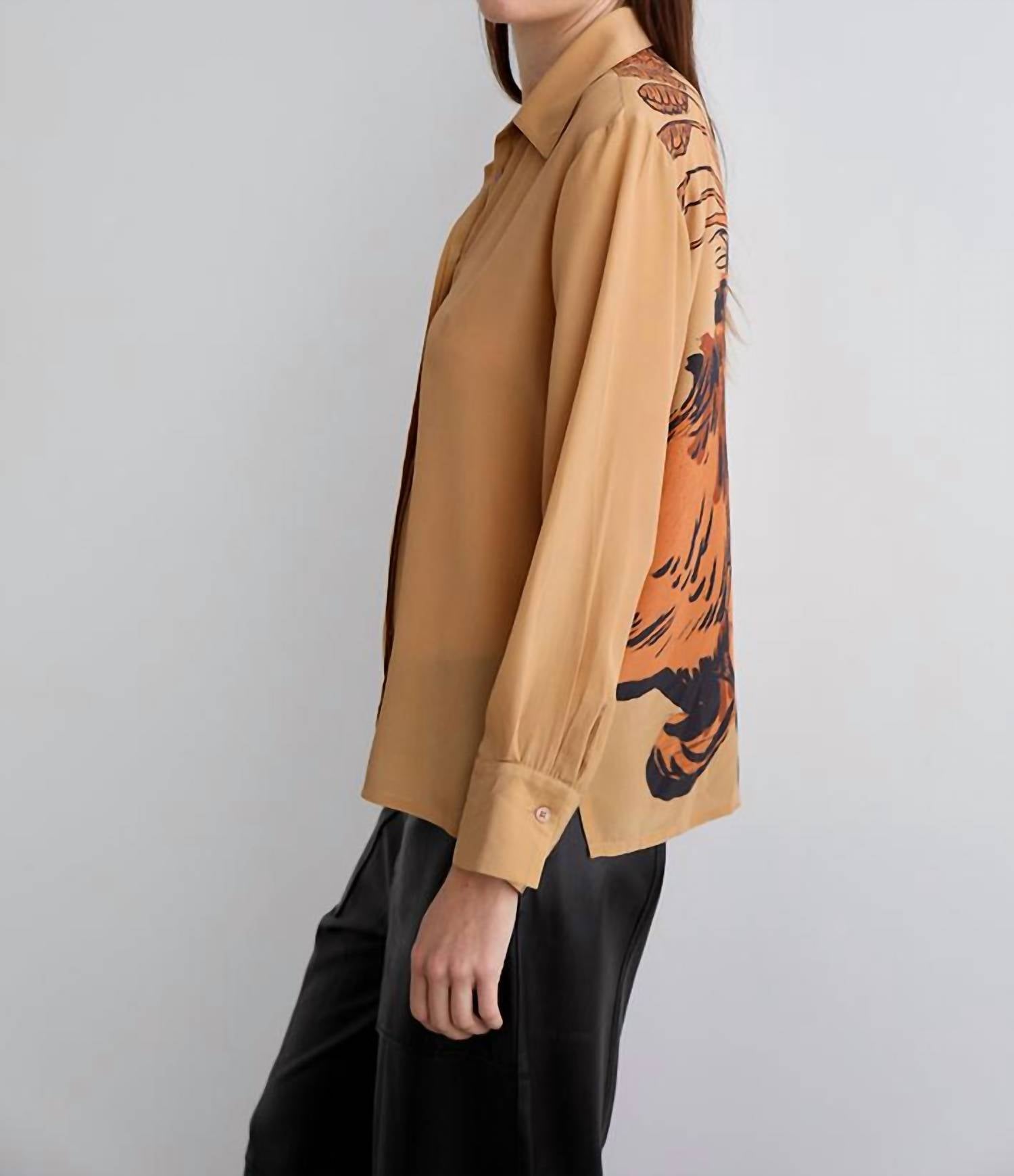 Perfectly tailored and soft to the touch. Introducing the Lion Palm Shirt by Las Sureñas, an expressive addition to your wardrobe with its artistic flair. This women's long sleeve button-down shirt features a striking large graphic of a lion in profile, rendered in warm shades of orange, rust, and deep brown on a camel background. Its lightweight, drapey fabric promises comfort and style for the upcoming fall season, making it perfect for Back to School or semi formal occasions. The shirt is finished with a classic collar and button closure for a sophisticated touch.