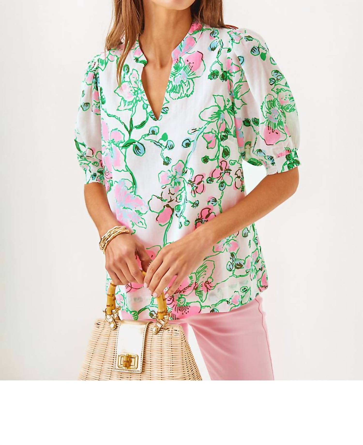 A timeless blouse that will never go out of style. Introducing the Brinelle Top by Lilly Pulitzer, a vibrant piece embodying a floral maximalist design perfect for summer vacation style. This easy fit blouse features short sleeves and a flattering V-neckline, crafted from a soft Mira Cotton Viscose Lawn blend (55% Cotton, 45% Viscose) offering a comfortable yet chic look. With a length of 25 inches for size small/4, the top gracefully skims the body with a roomier fit and is styled with a pull-on closure. Complete your care routine by hand washing cold, separately, or opting for dry clean.