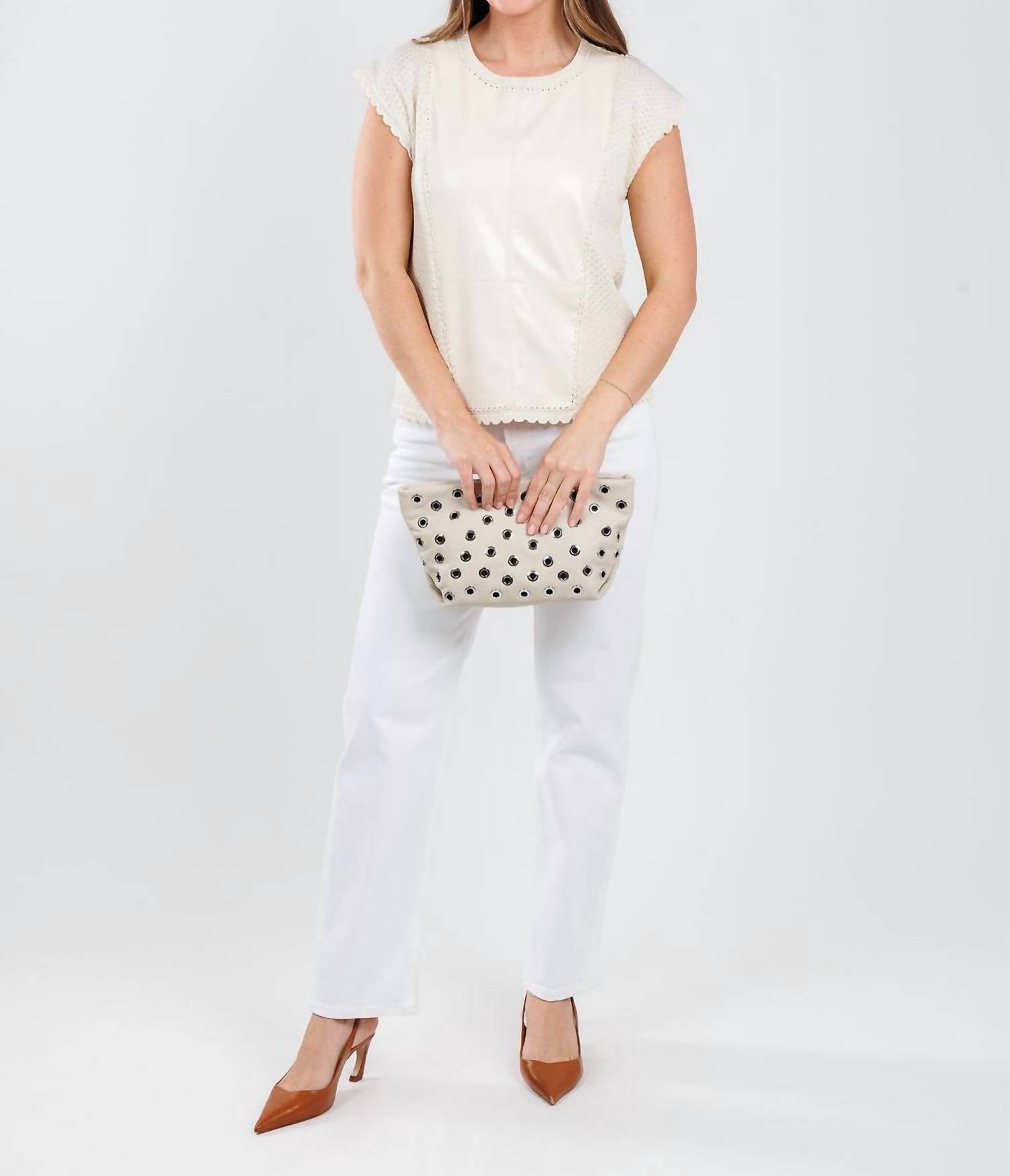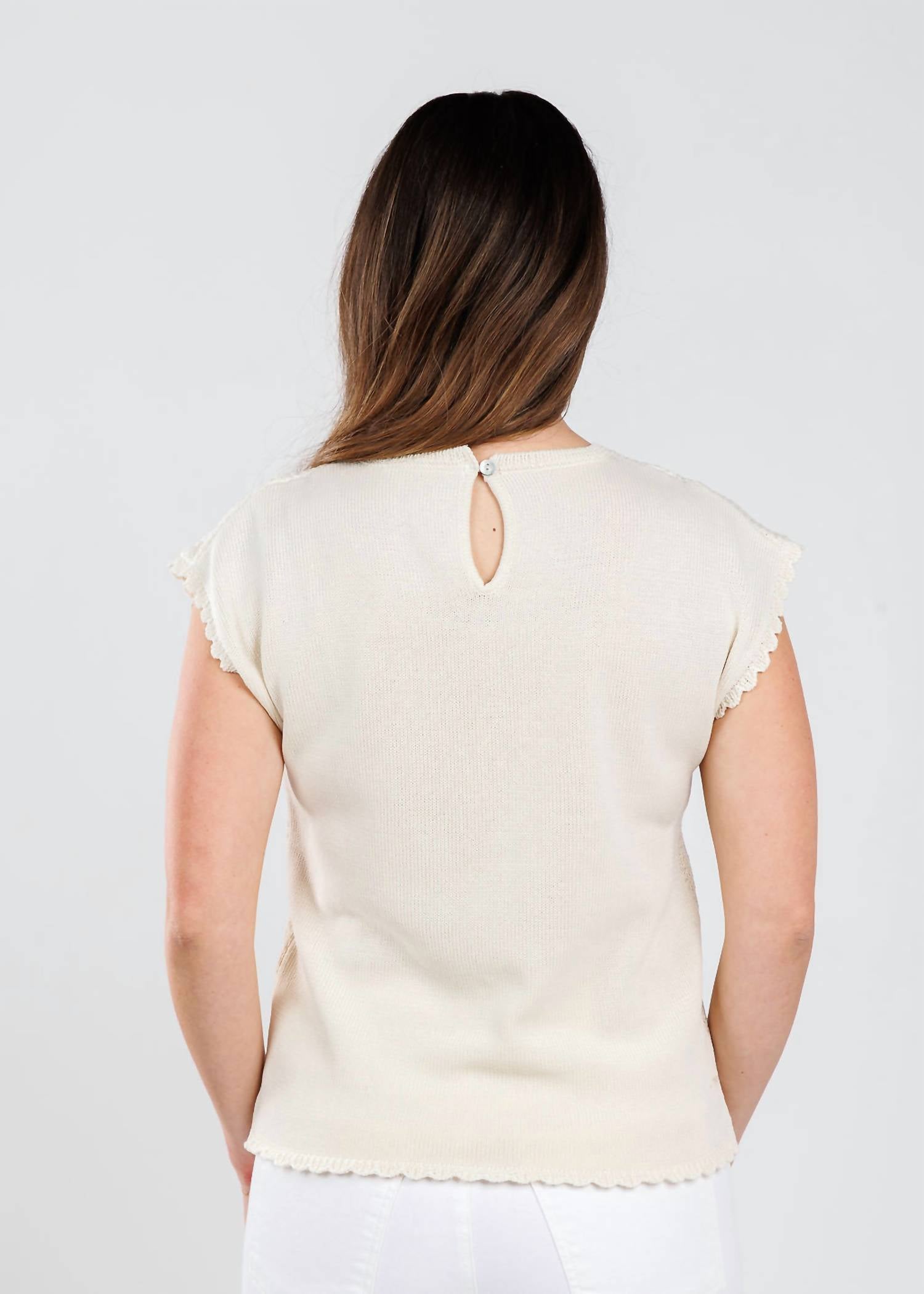 Discover the Calanthe Top by Melissa Nepton, a cream-colored embodiment of boho chic style. This women's tee features cap sleeves and is crafted from a cotton blend, comprising 65% Mercerized Cotton and 35% Polyurethane, with a unique faux leather front panel and crochet knit sleeves. Designed with a crew neck and scalloped edges, this top makes a chic statement with its pull-on closure. Perfect for summer vacations, it’s a versatile piece that pairs wonderfully with both casual denim and sophisticated trousers. Model Faryn is wearing a size small (5'6" tall, 34" bust, 28.5" waist, 31" hip, 29" inseam).
