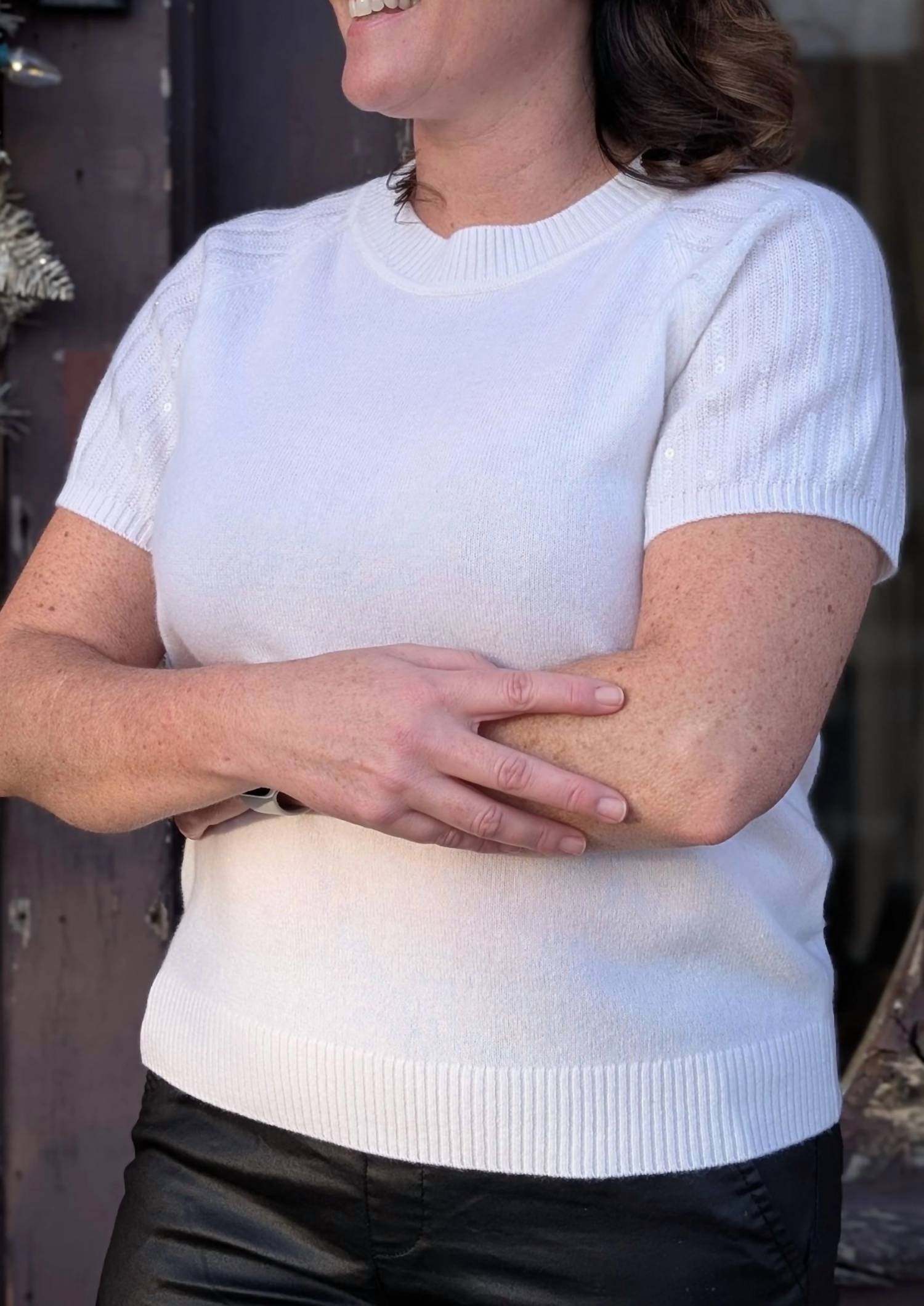 A timeless blouse that will never go out of style. Unveil timeless elegance with the Sequin Cashmere Raglan Top by Minnie Rose. Designed for a fun, relaxed fit, this piece features short sequin sleeves and a classic crewneck, ideal for both lounging and outings. Composition: 100% Cashmere. Closure: Pull on. Care: Turn inside out, hand wash in cold water, do not wring, dry flat.
